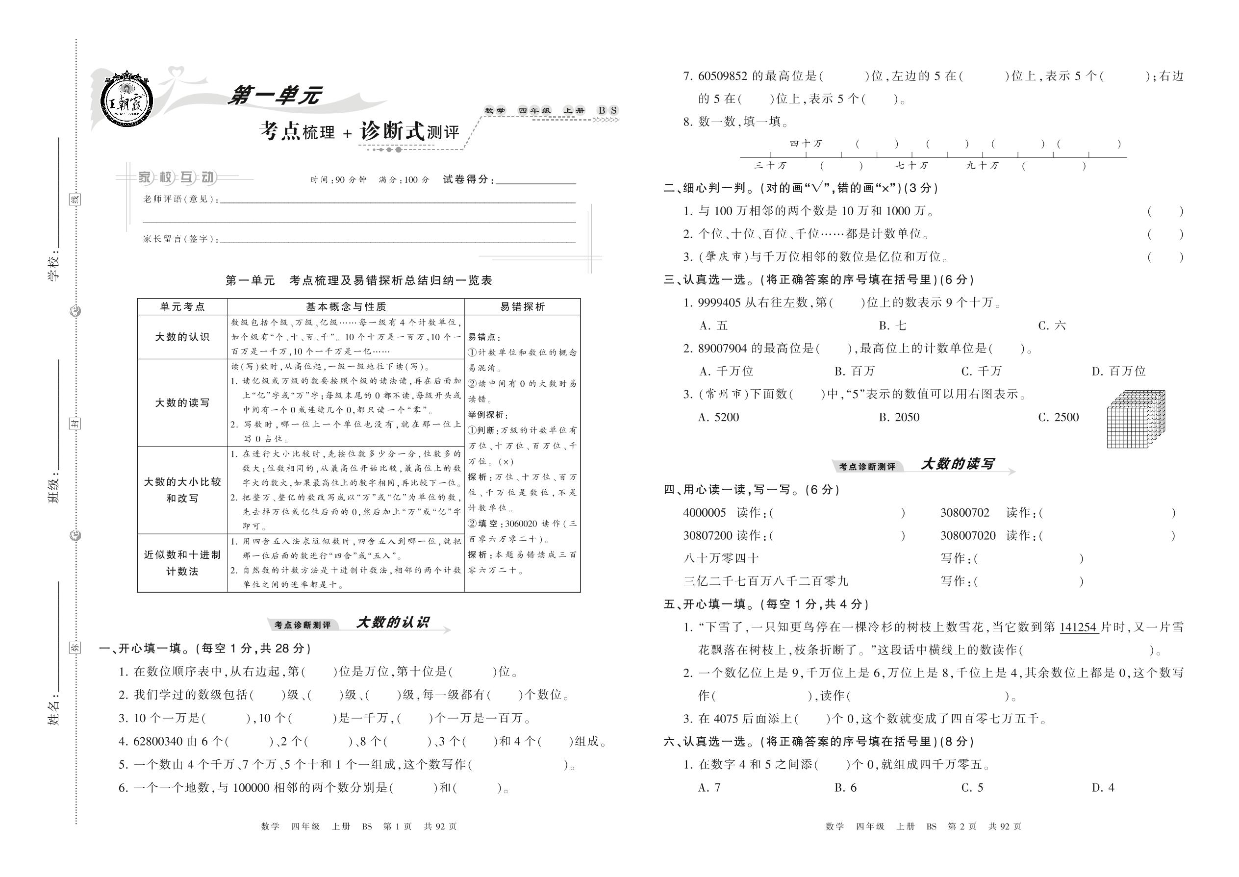 2021上册四年级数学北师版 第一单元 考点梳理 + 诊断式测评