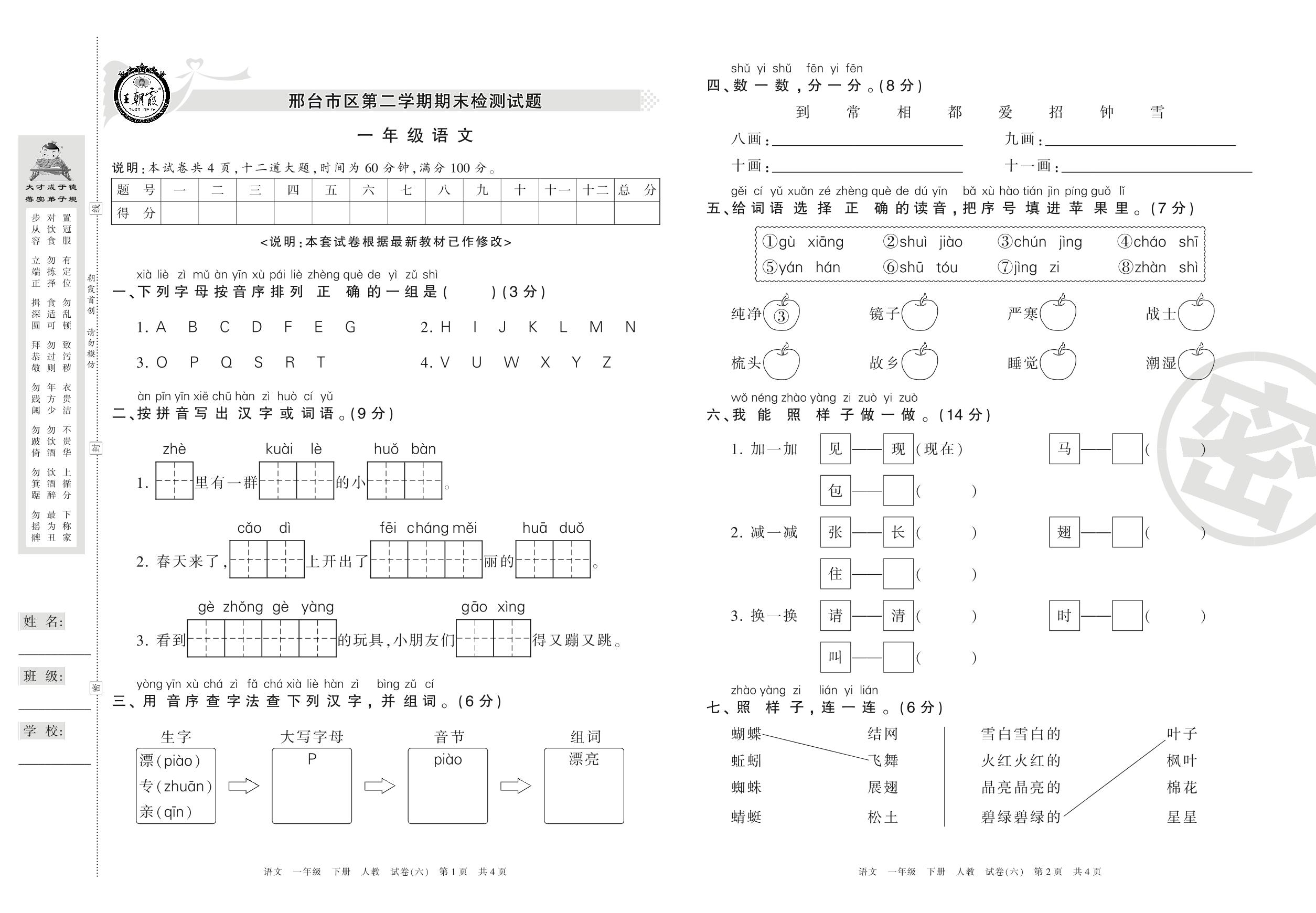 2015-2016学年第二学期邢台市区一年级语文试卷(人教版)【6】