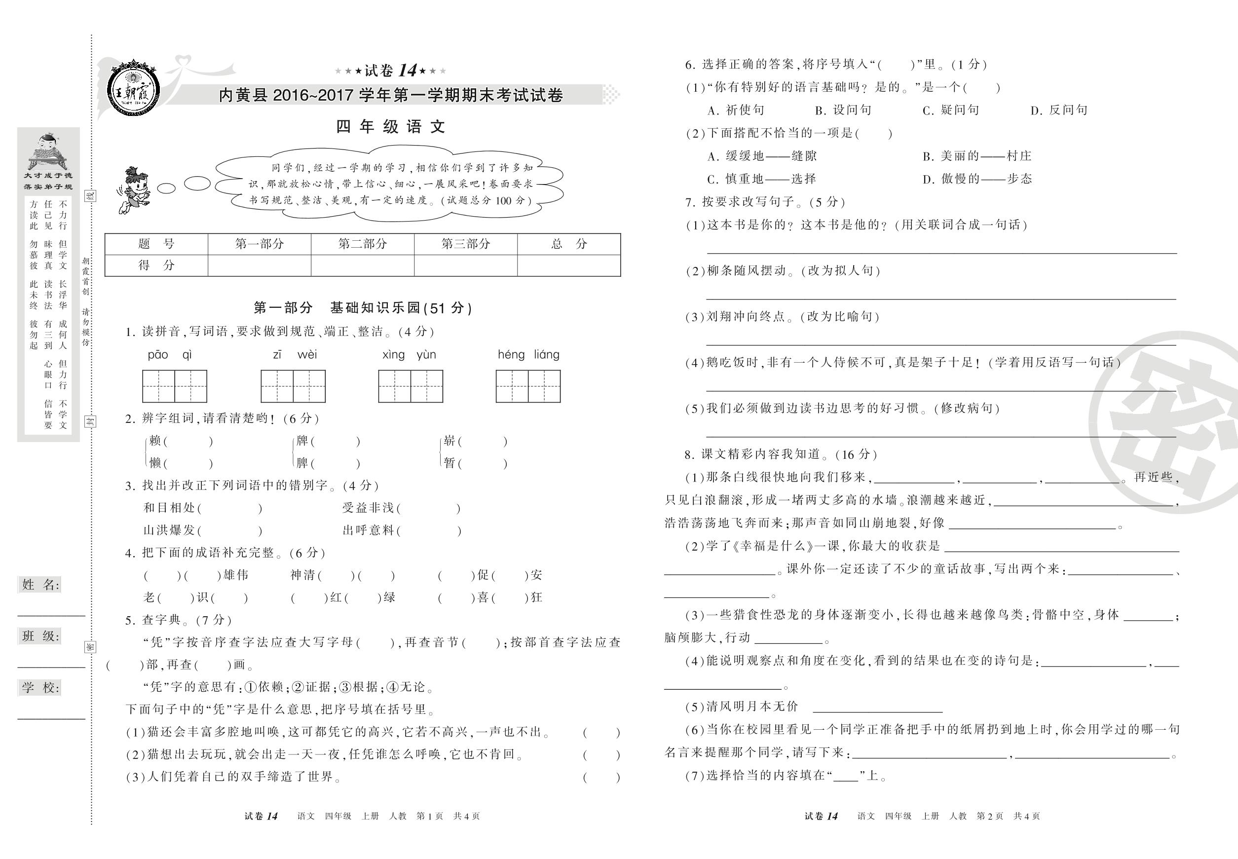2016-2017学年第一学期安阳市内黄县四年级语文试卷(人教版)【14】