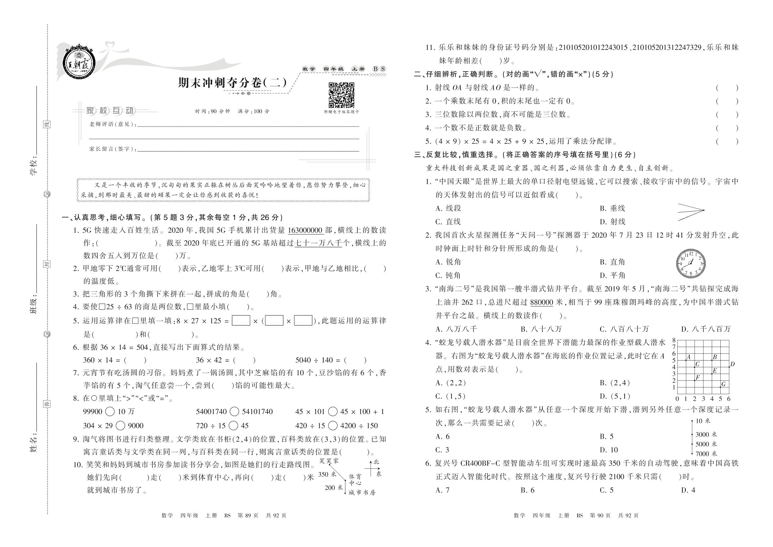 2021上册四年级数学北师版 期末冲刺夺分卷(二)