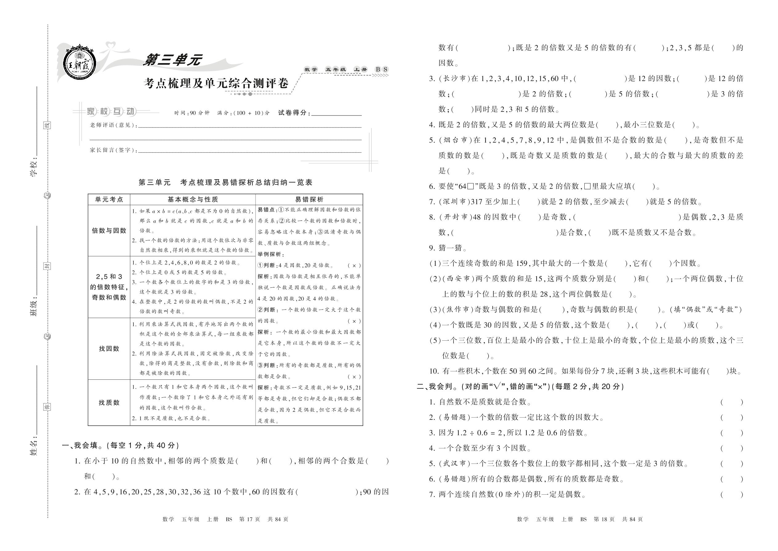 2021上册五年级数学北师版 第三单元 考点梳理及单元综合测评卷