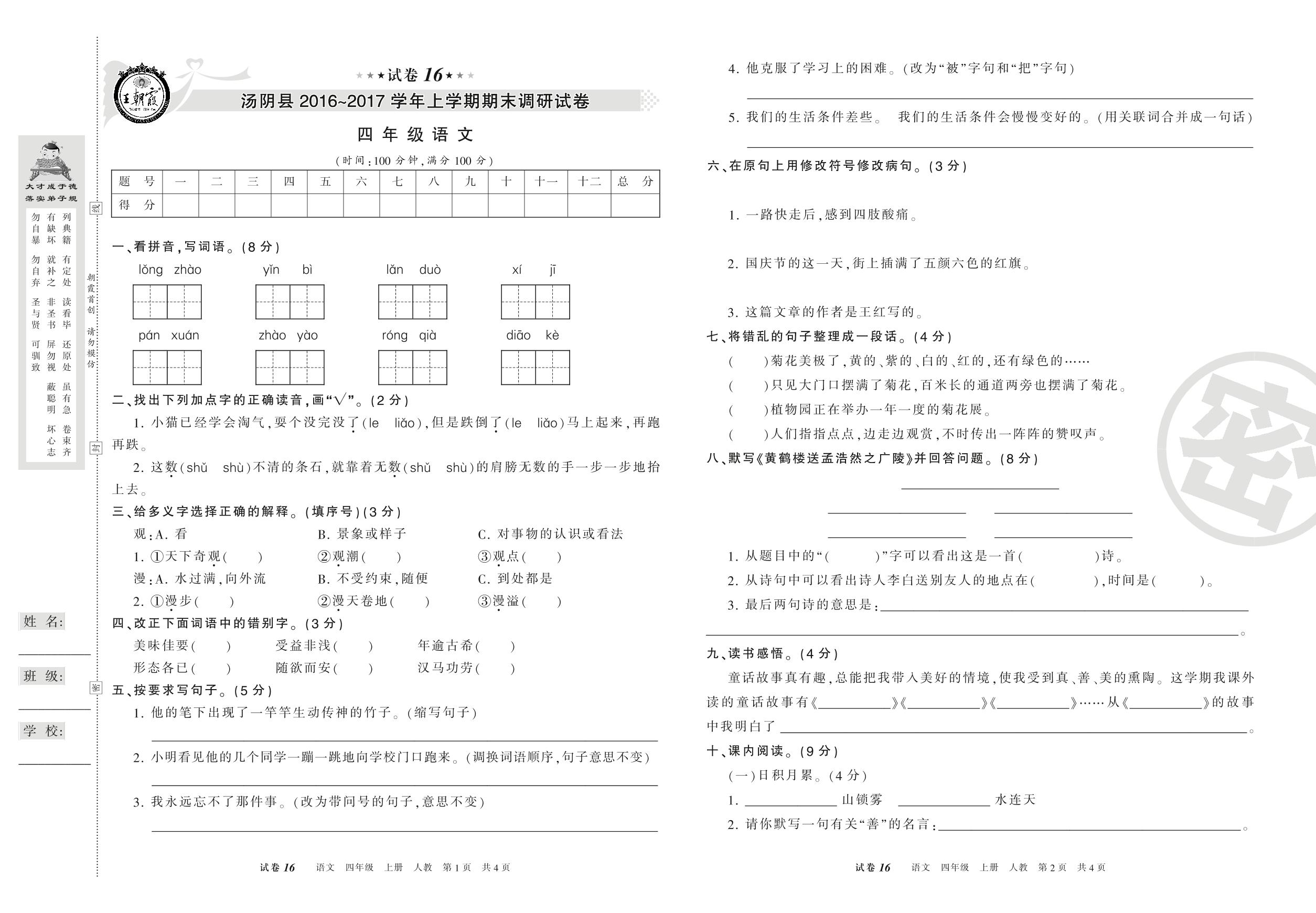 2016-2017学年第一学期安阳市汤阴县四年级语文试卷(人教版)【16】