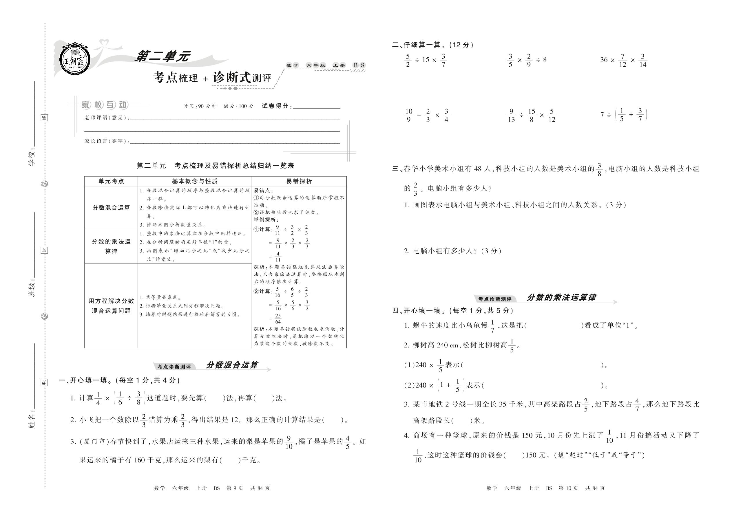 2021上册六年级数学北师版 第二单元 考点梳理 + 诊断式测评