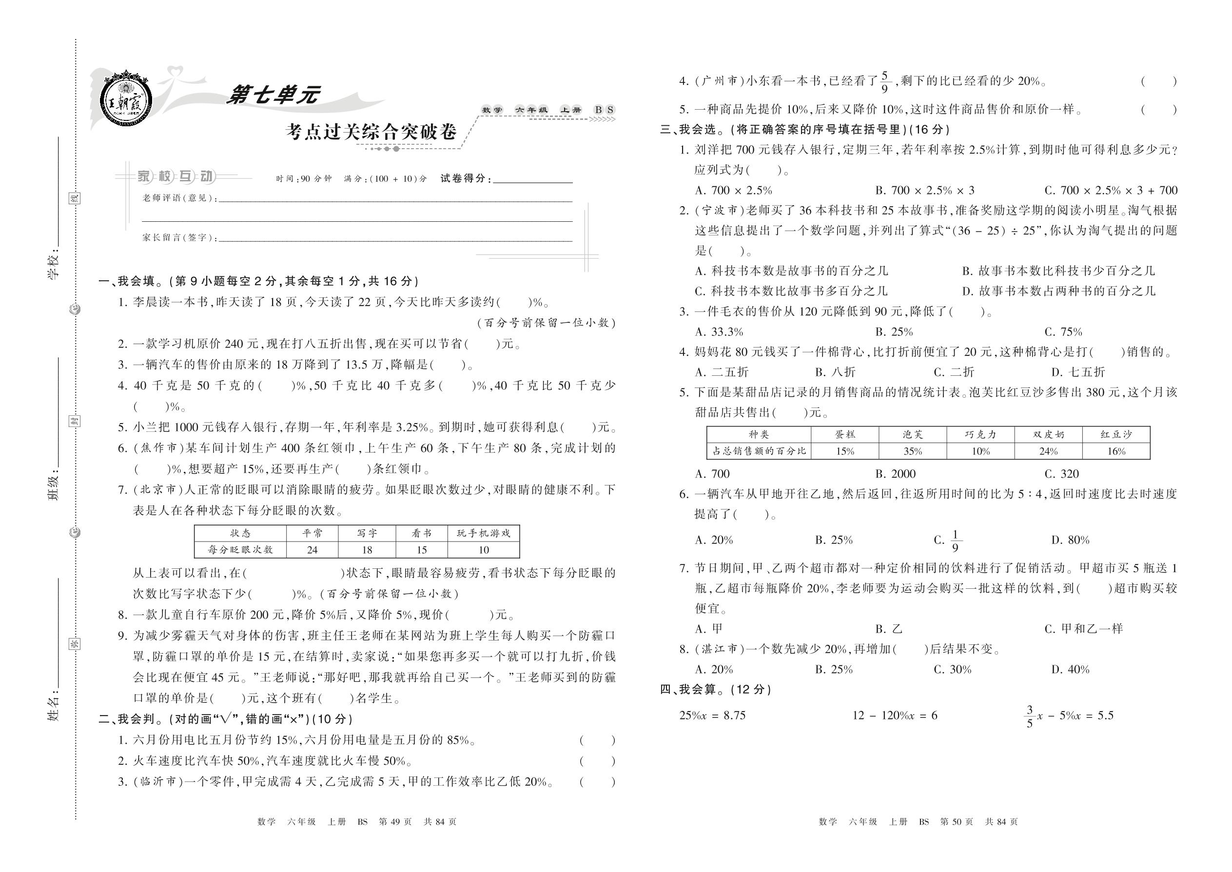 2021上册六年级数学北师版 第七单元 考点过关综合突破卷