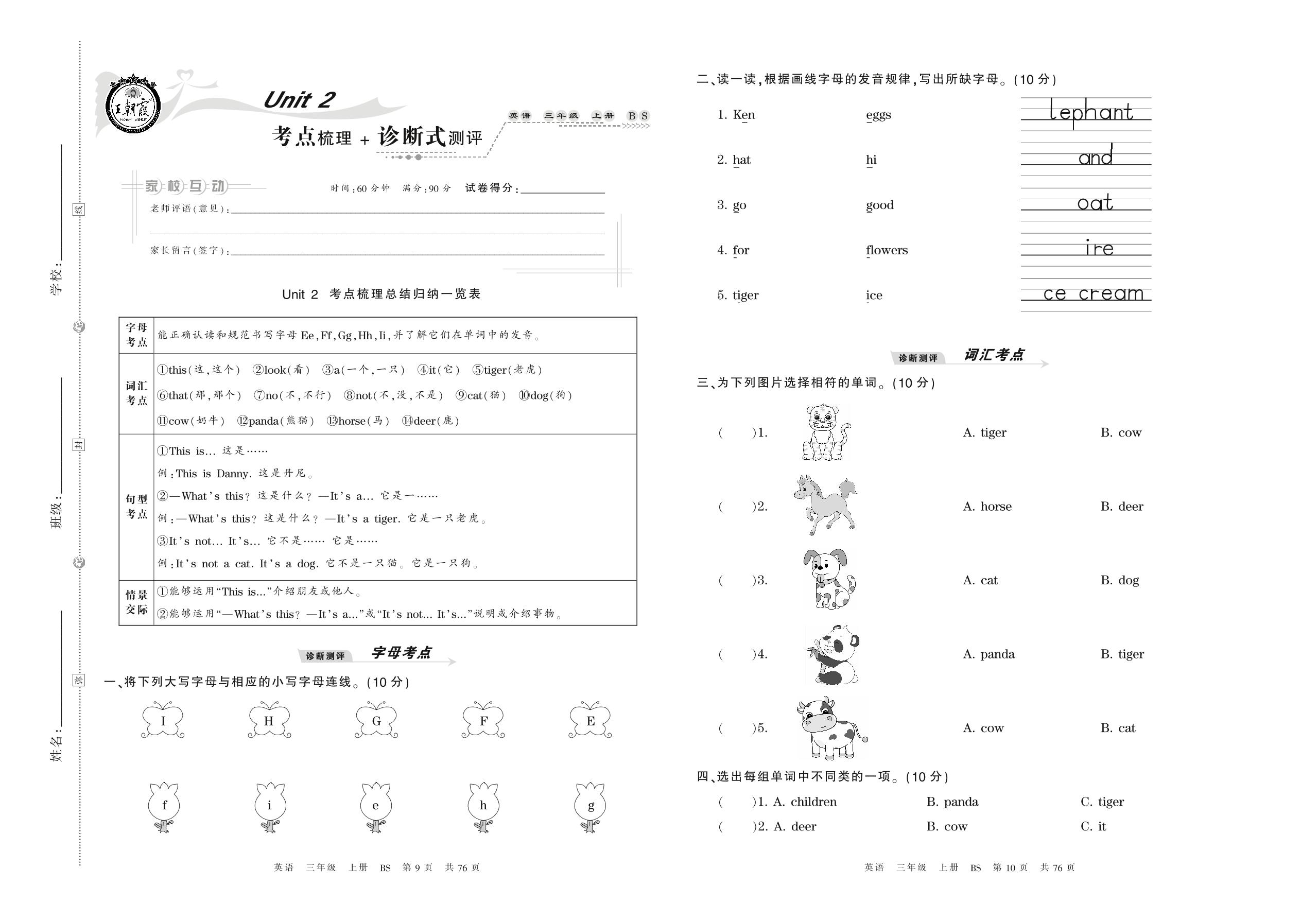 2021上册三年级英语北师版 Unit 2 考点梳理 + 诊断式测评