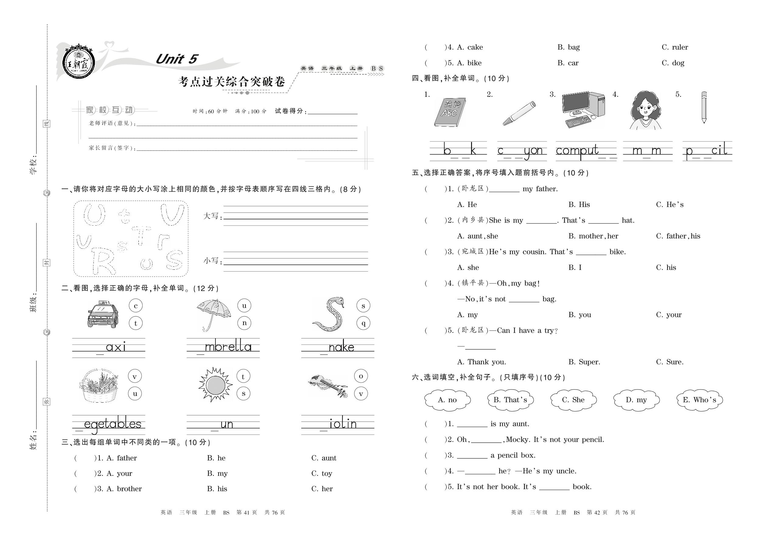 2021上册三年级英语北师版 Unit 5 考点过关综合突破卷