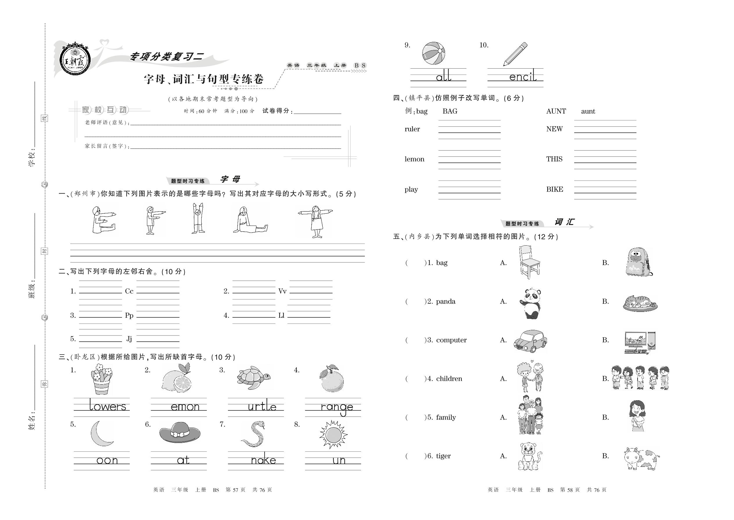 2021上册三年级英语北师版 字母、词汇与句型专练卷