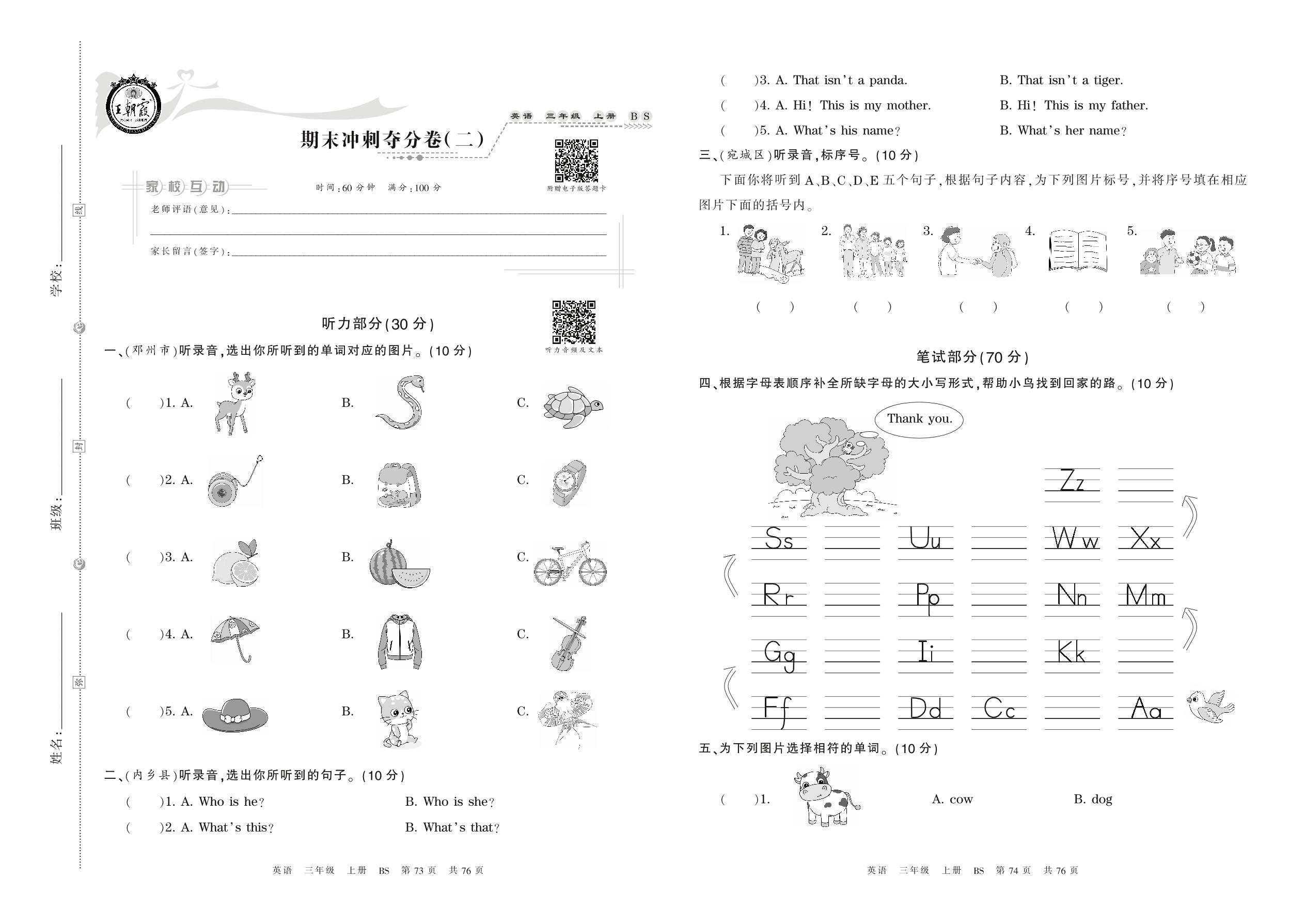 2021上册三年级英语北师版 期末冲刺夺分卷(二)