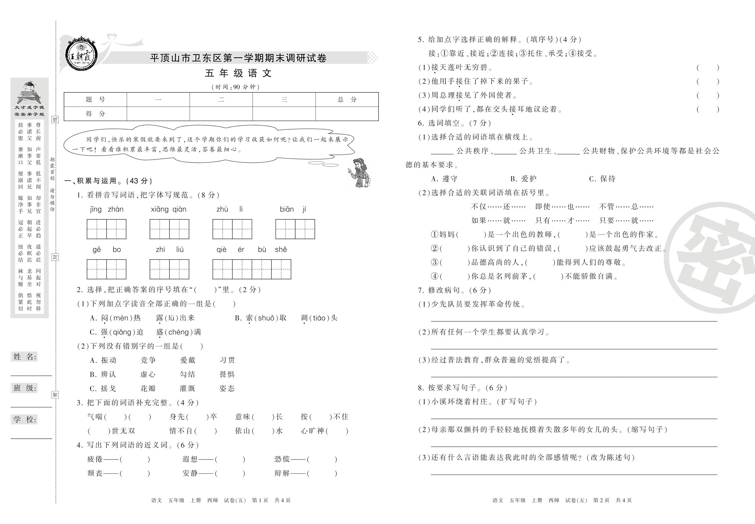 2016-2017学年第一学期平顶山市卫东区五年级语文试卷(西师版)【5】