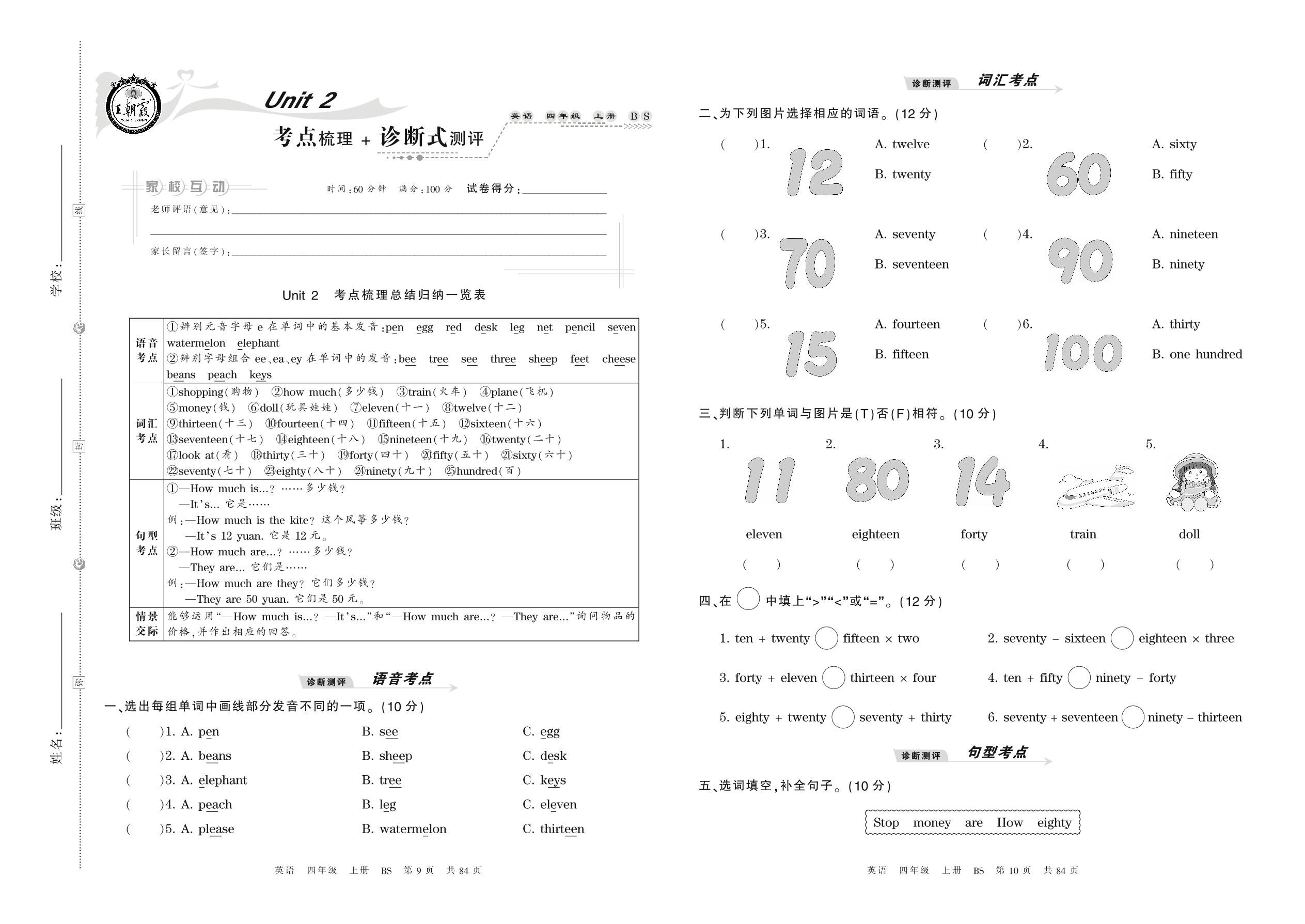 2021上册四年级英语北师版 Unit 2 考点梳理 + 诊断式测评