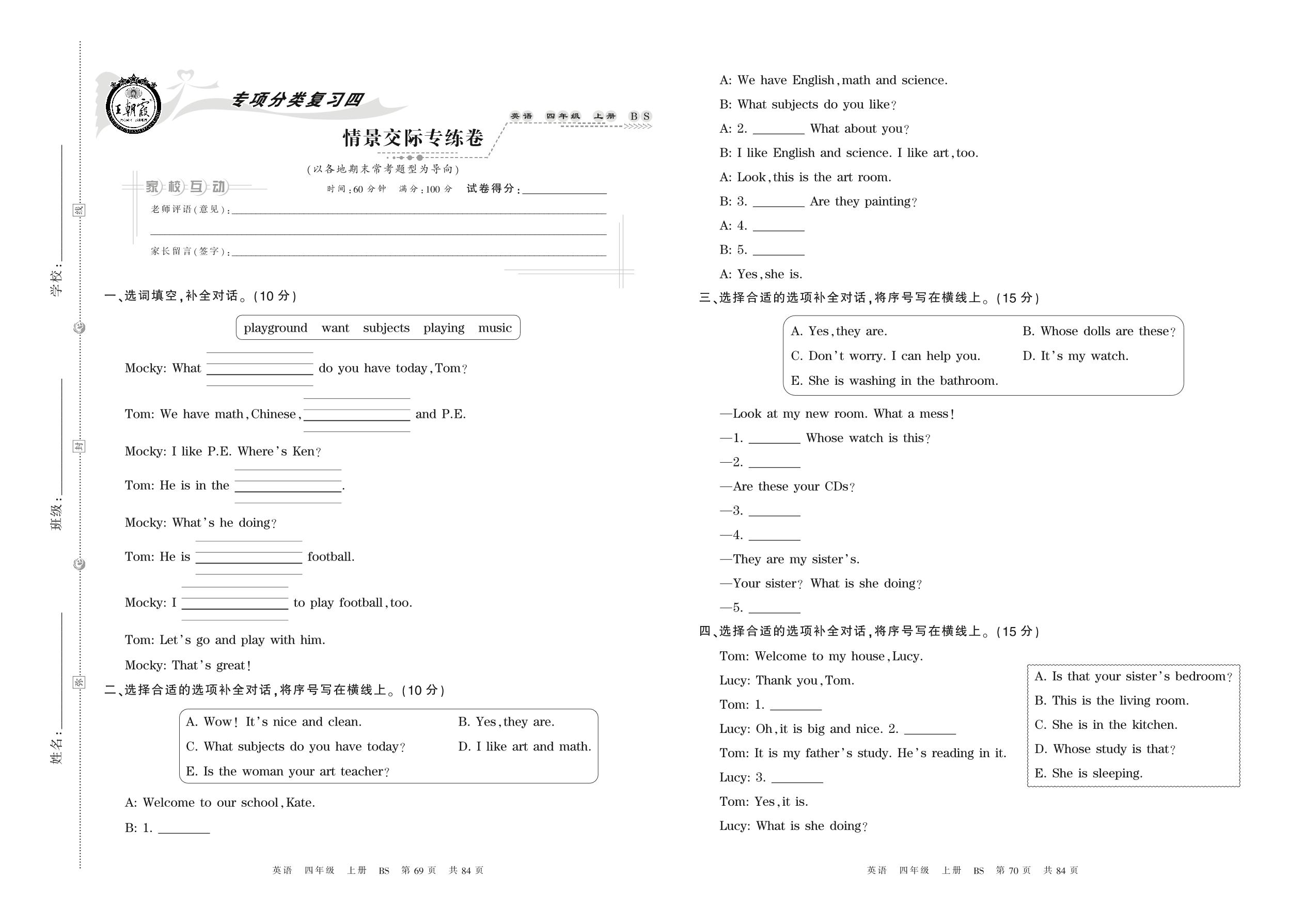 2021上册四年级英语北师版 情景交际专练卷