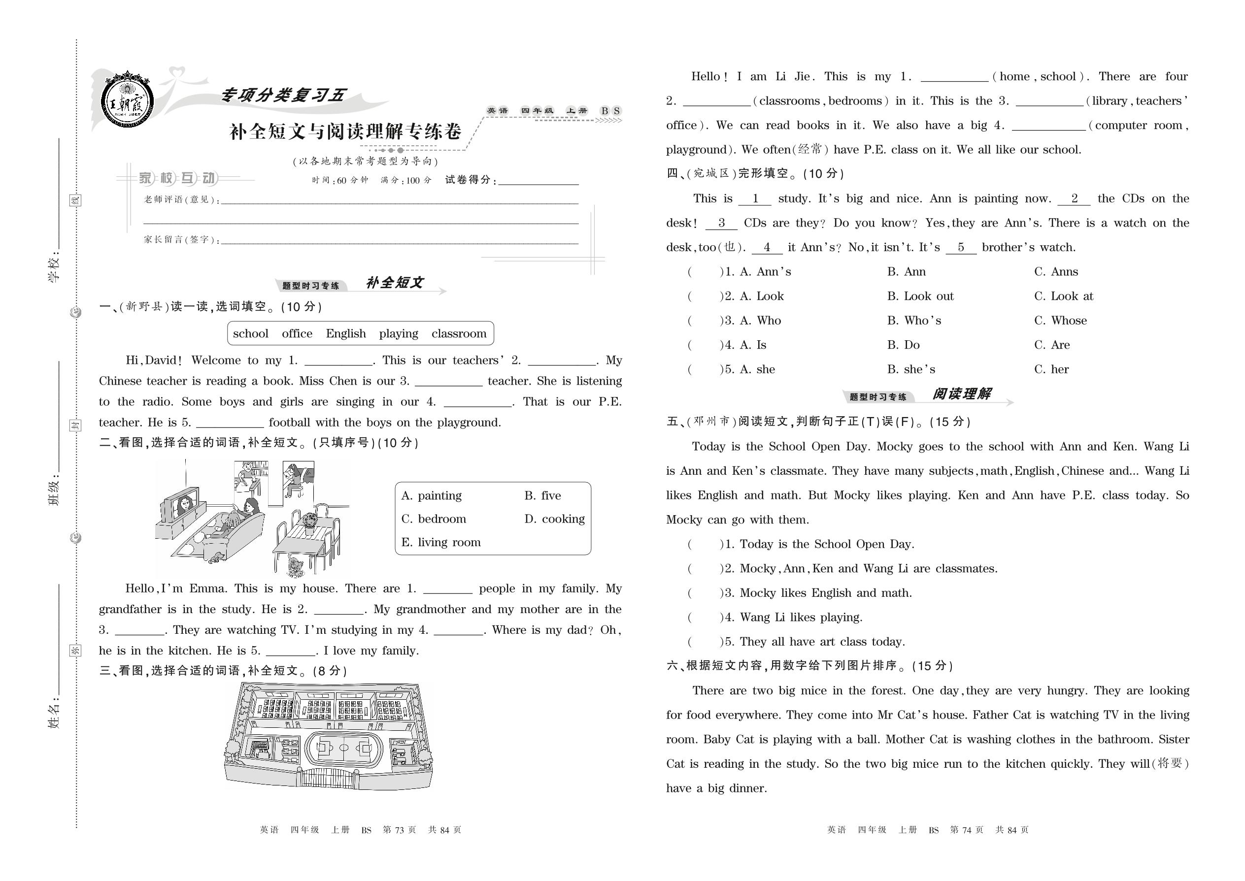 2021上册四年级英语北师版 补全短文与阅读理解专练卷