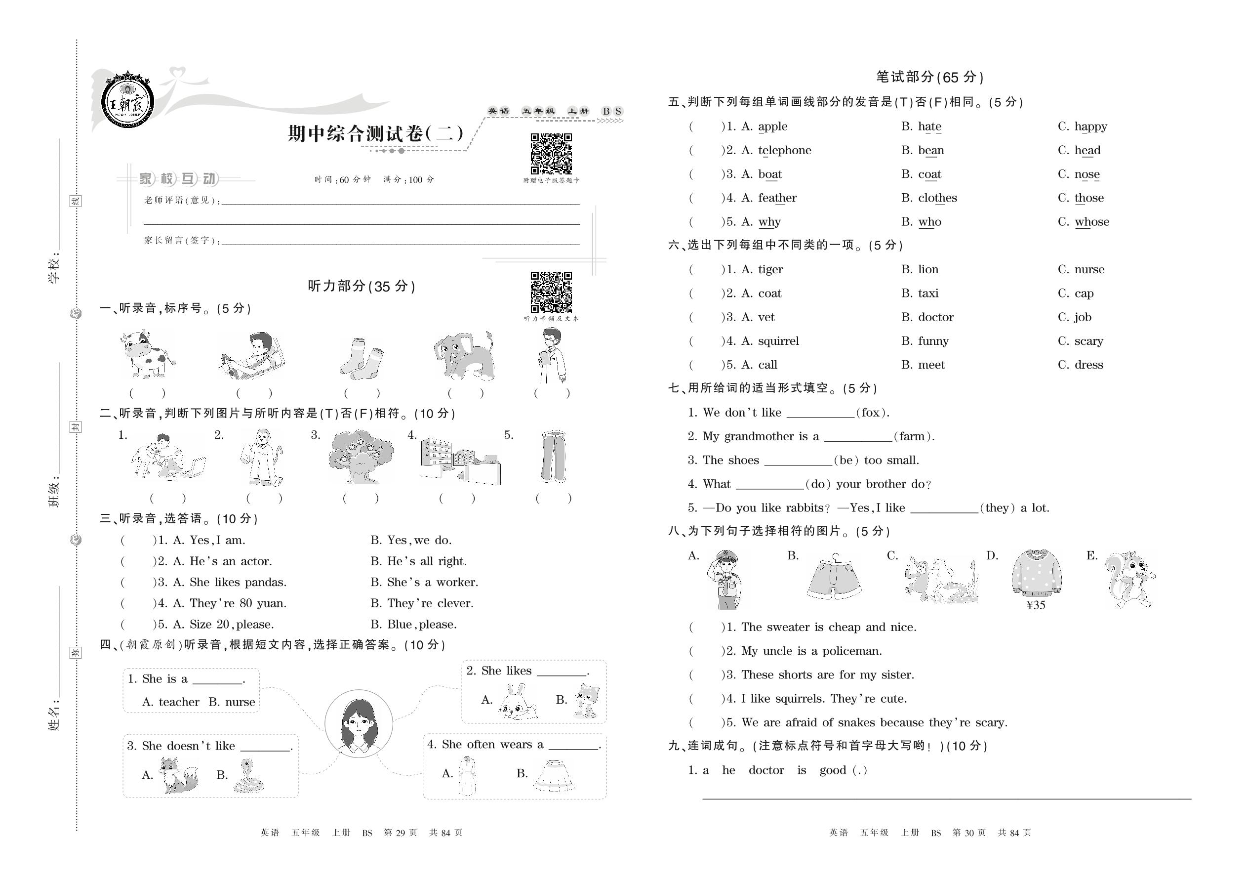 五年级英语北师版上册期中卷