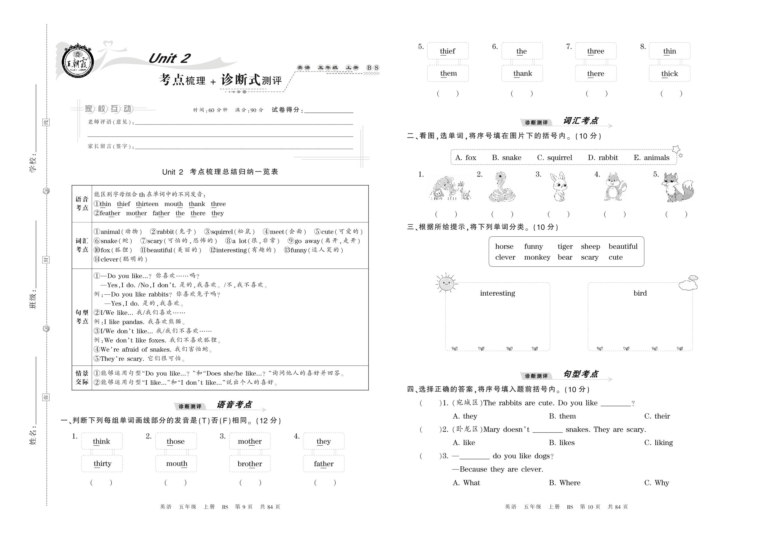 2021上册五年级英语北师版 Unit 2 考点梳理 + 诊断式测评