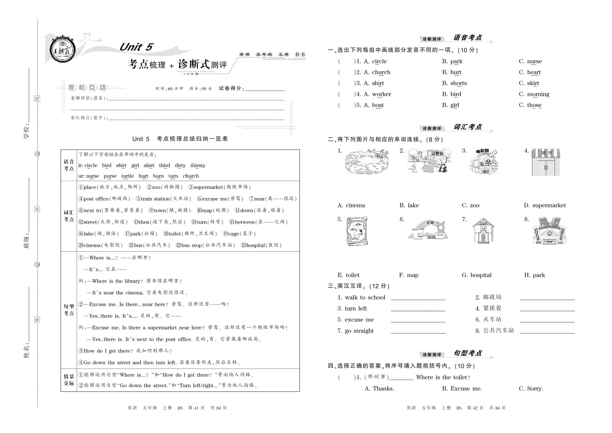 2021上册五年级英语北师版 Unit 5 考点梳理 + 诊断式测评