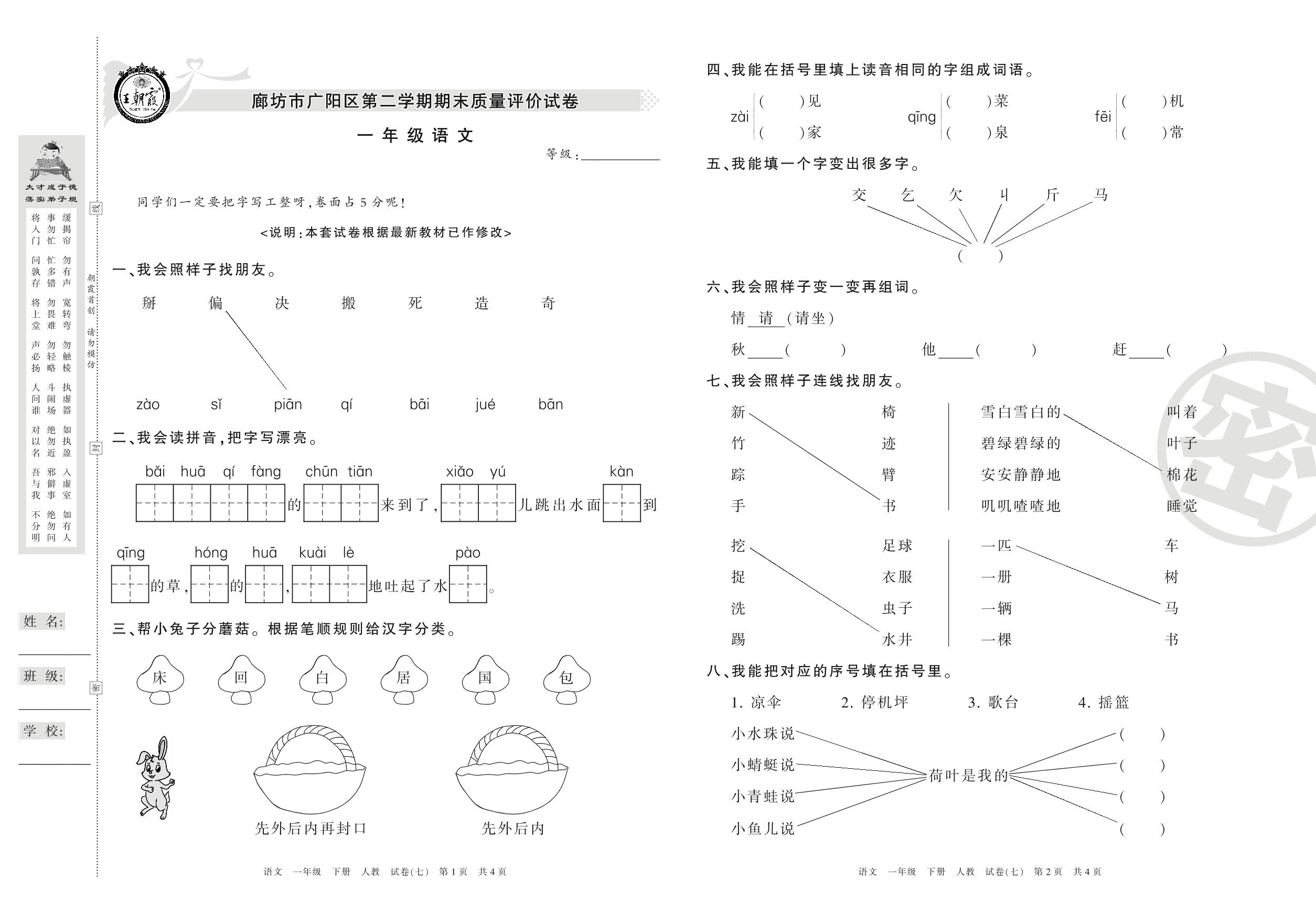 一年级语文人教版下册期末卷