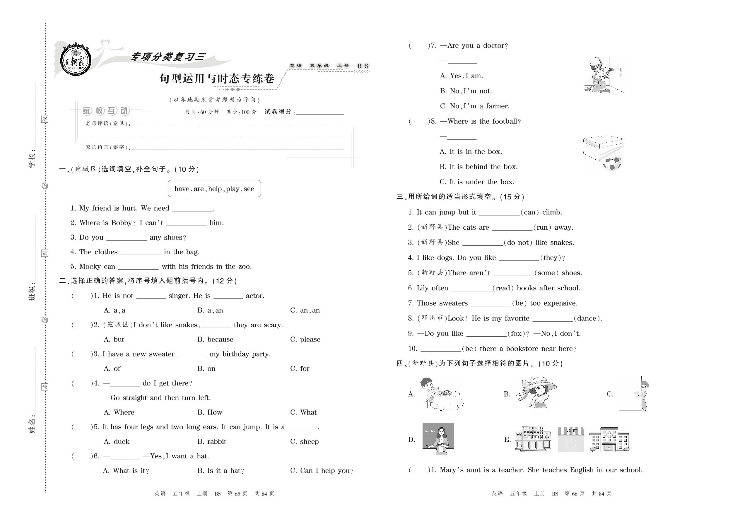 2021上册五年级英语北师版 句型运用与时态专练卷