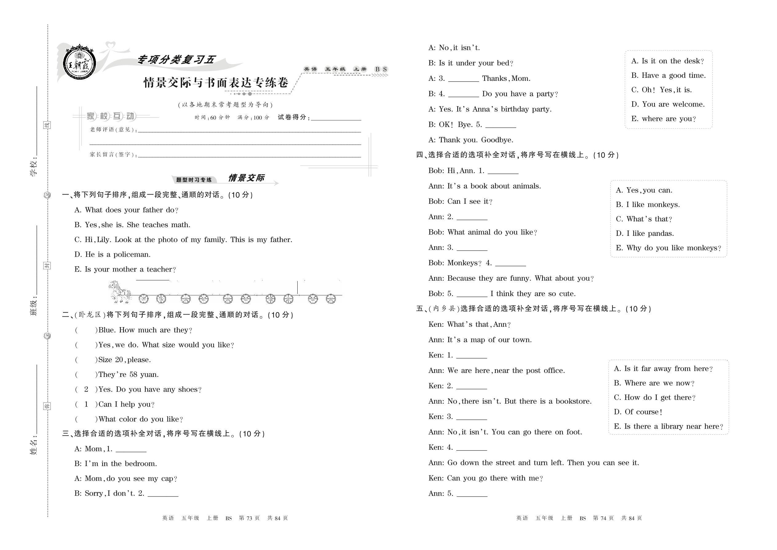 2021上册五年级英语北师版 情景交际与书面表达专练卷