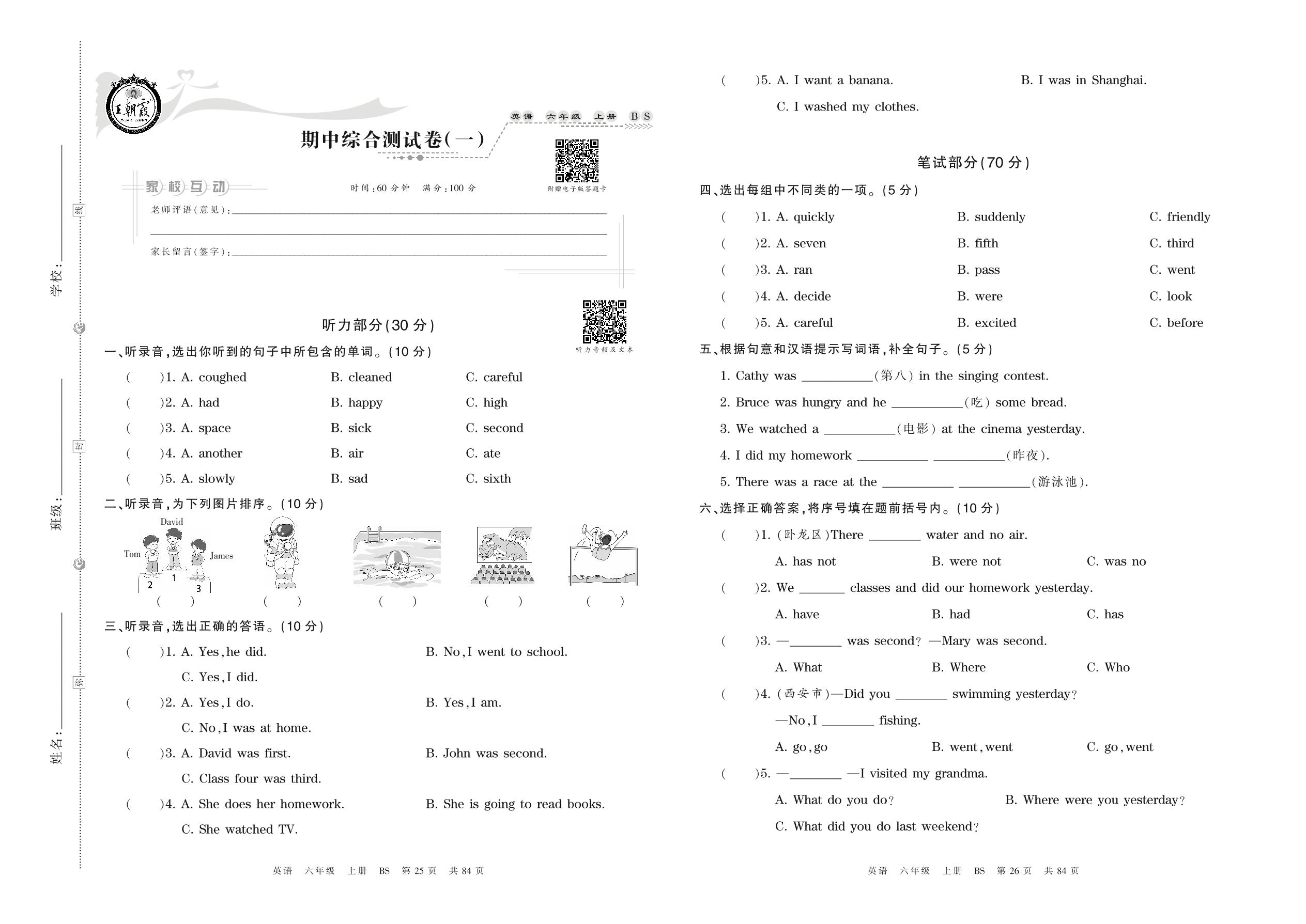 2021上册六年级英语北师版 期中综合测试卷(一)