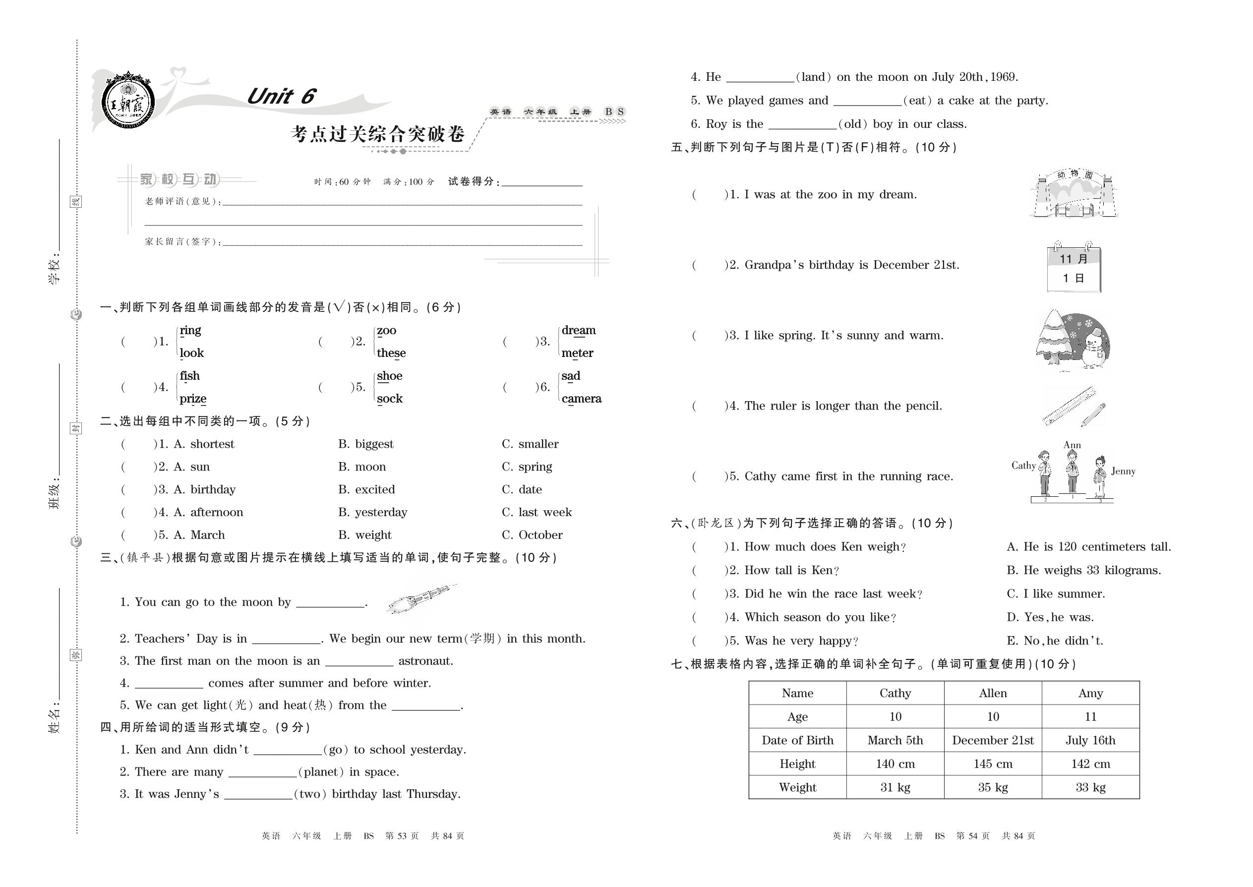 六年级英语北师版上册单元卷