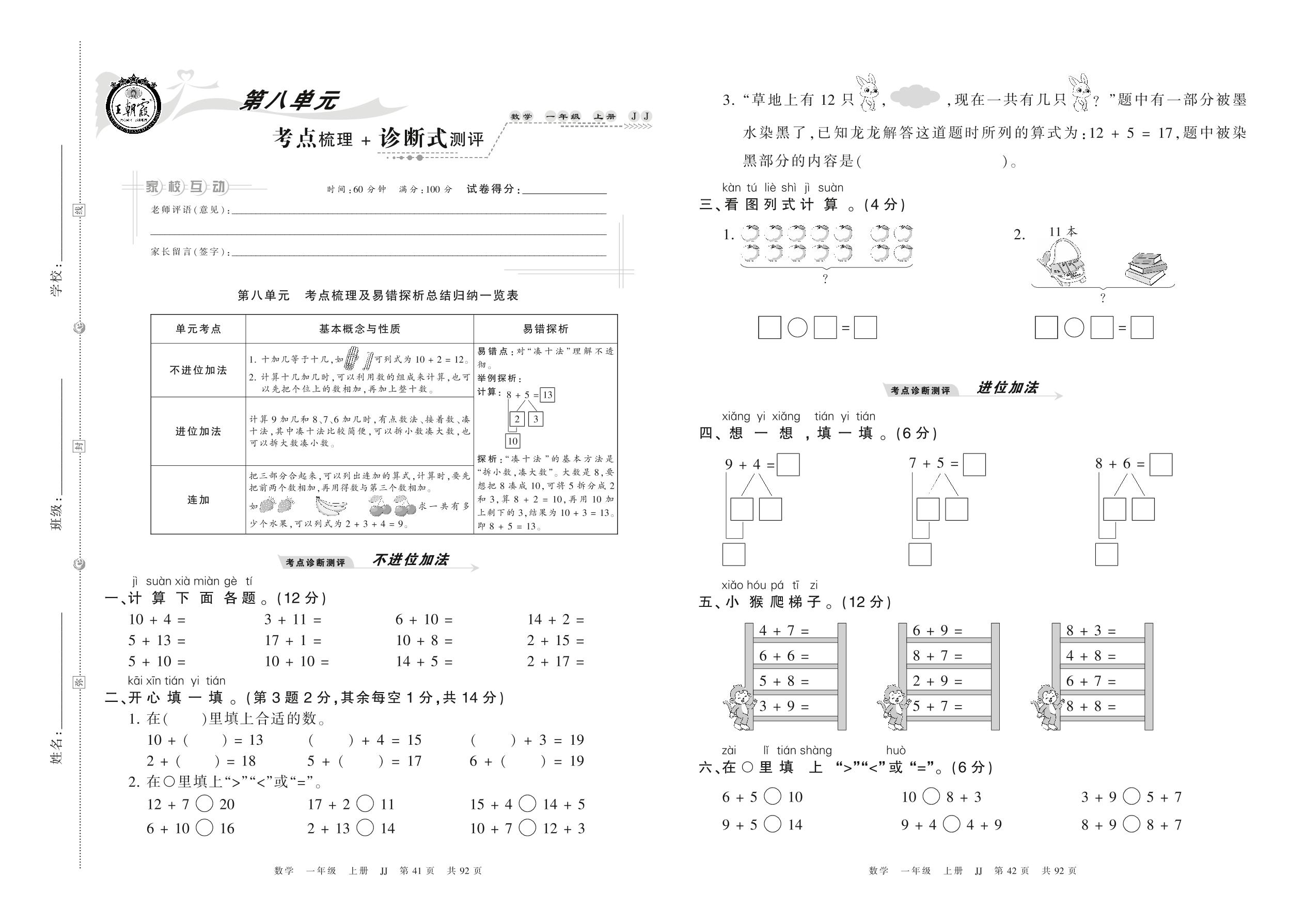 2021上册一年级数学冀教版 第八单元 考点梳理 + 诊断式测评