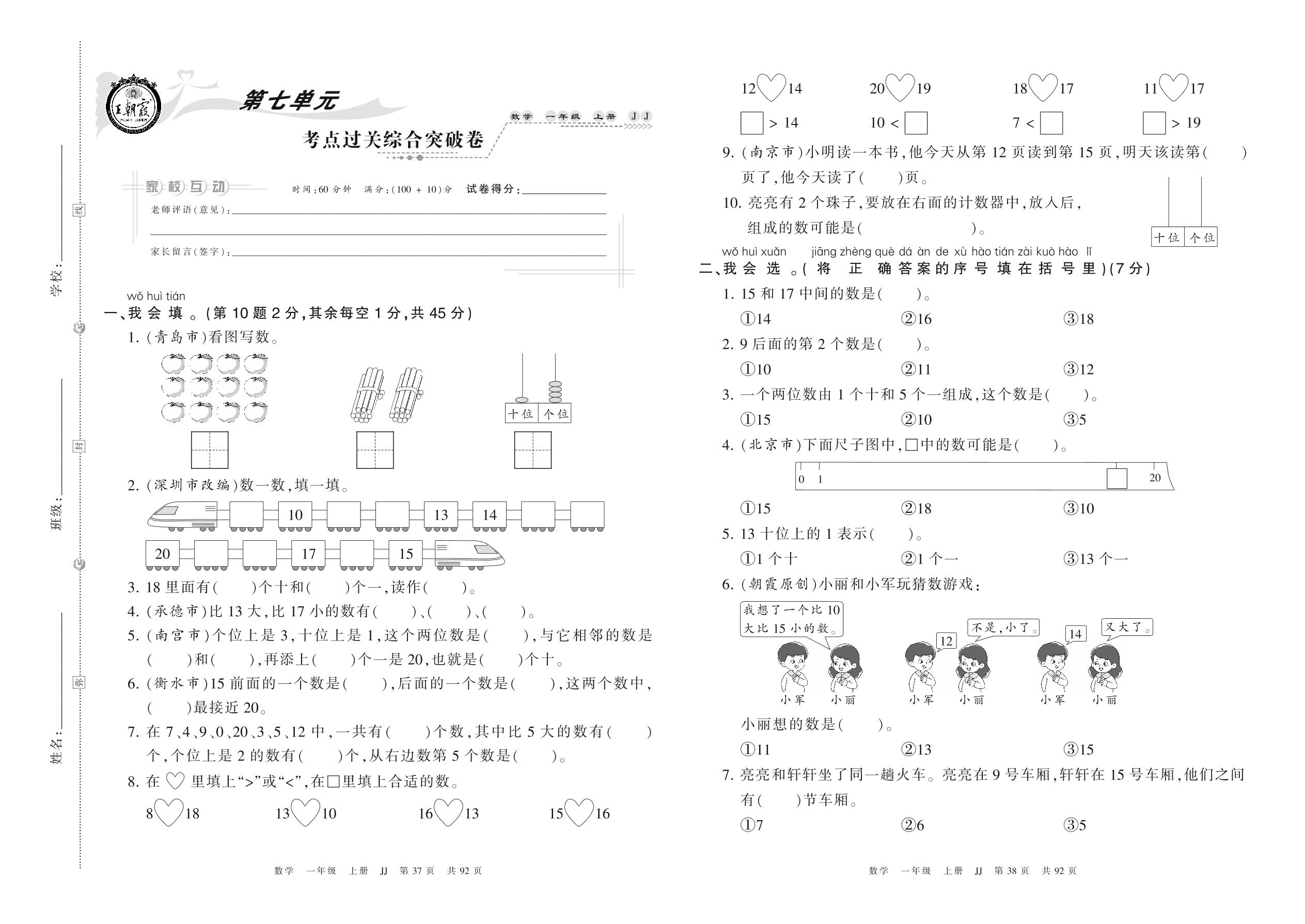 2021上册一年级数学冀教版 第七单元 考点过关综合突破卷