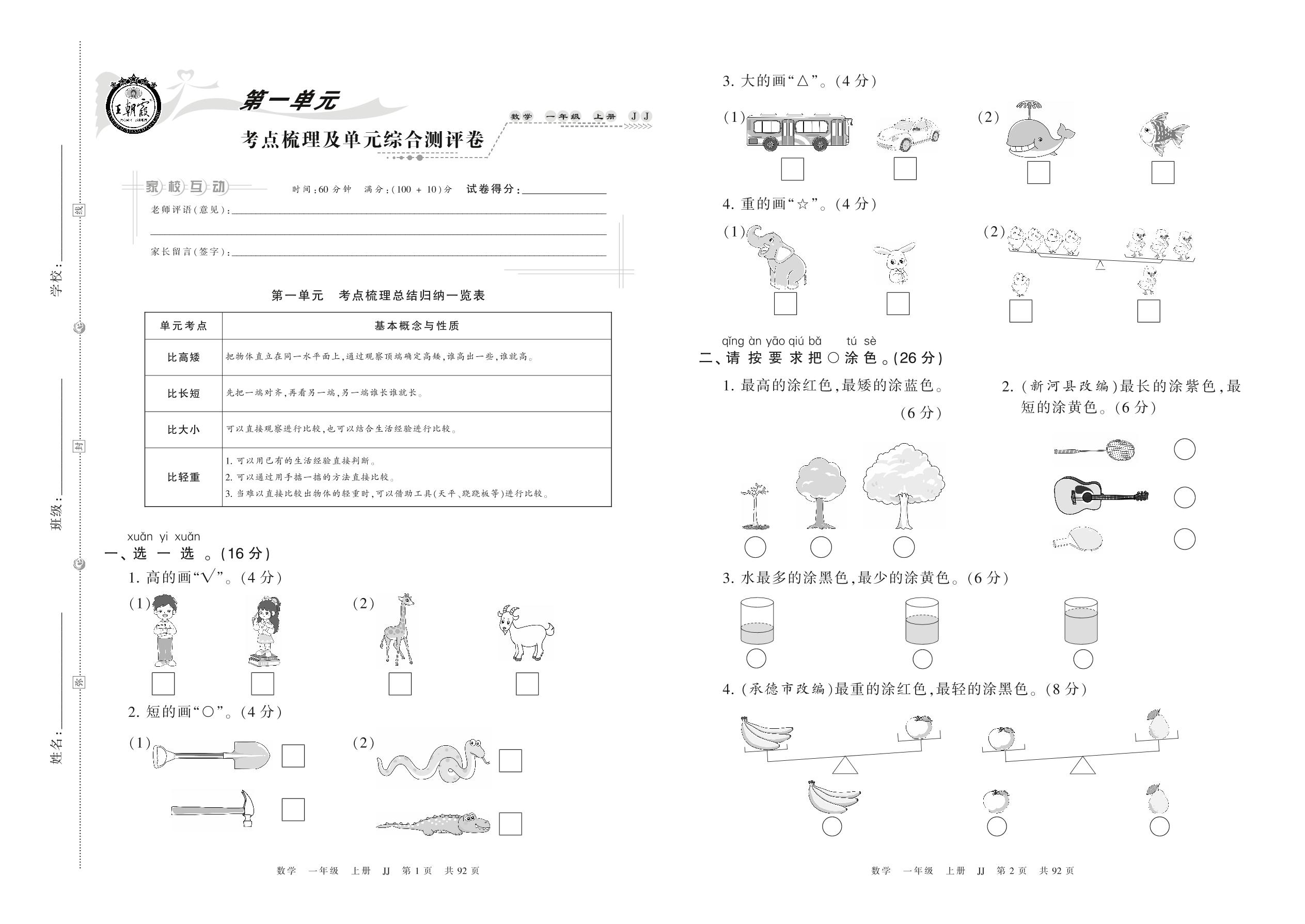 2021上册一年级数学冀教版 第一单元 考点梳理及单元综合测评卷
