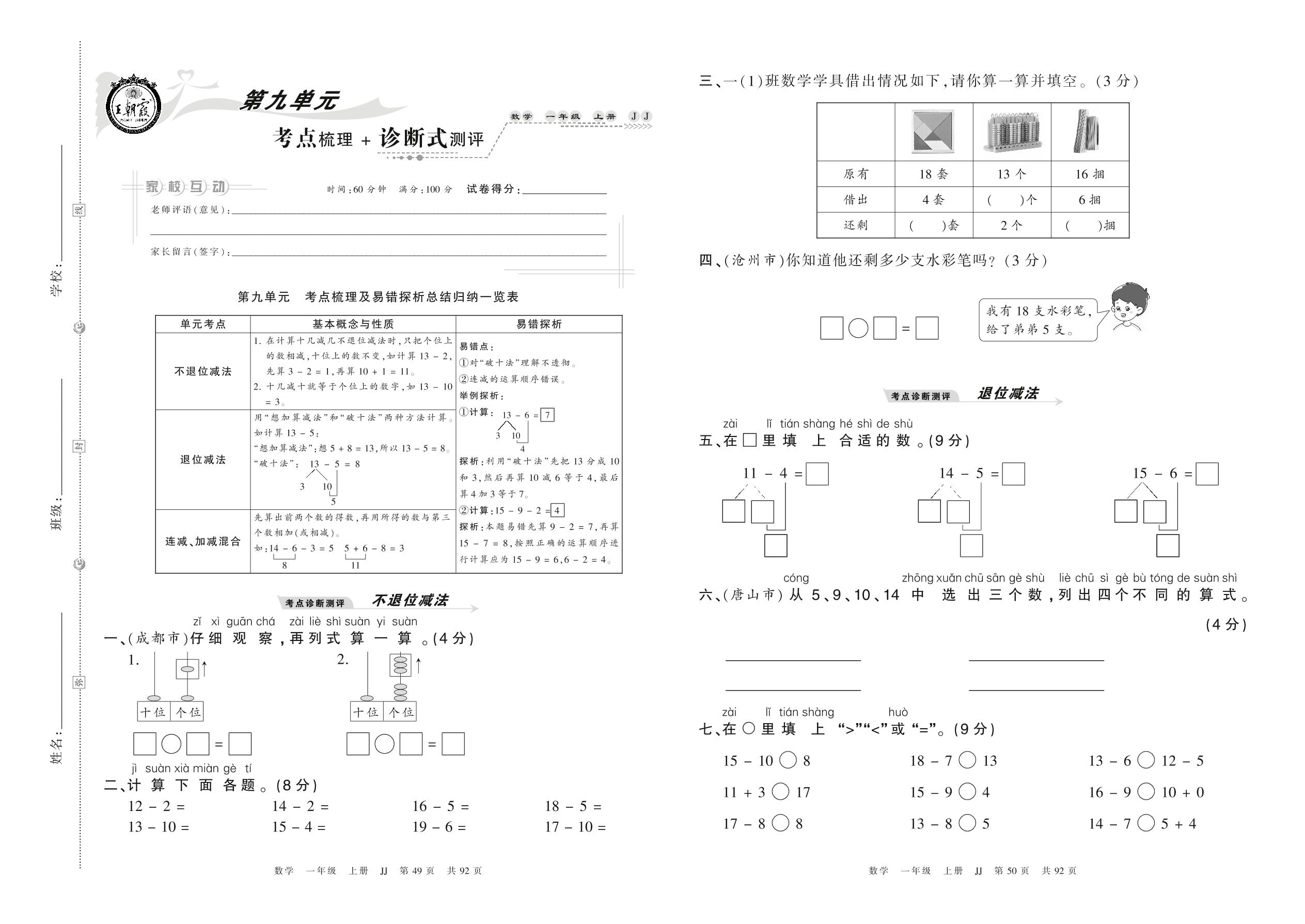 2021上册一年级数学冀教版 第九单元 考点梳理 + 诊断式测评