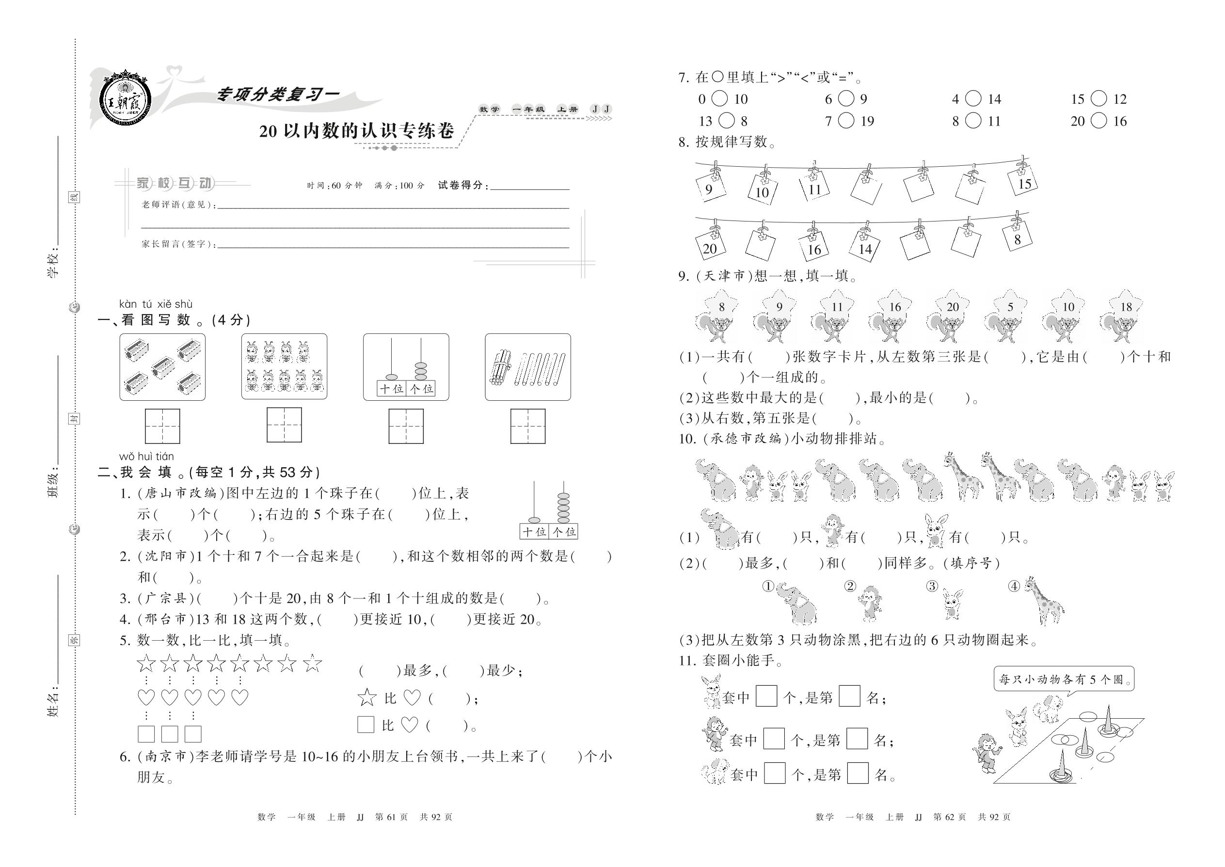 2021上册一年级数学冀教版 20以内数的认识专练卷