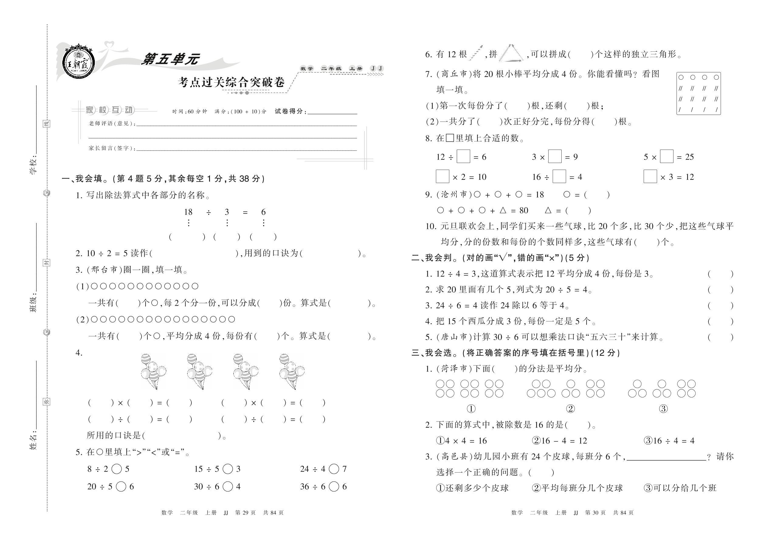 2021上册二年级数学冀教版 第五单元 考点过关综合突破卷
