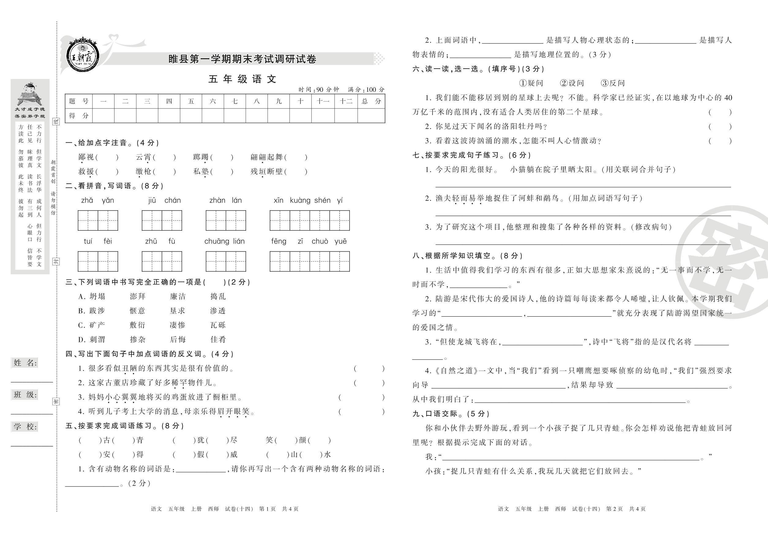 2016-2017学年第一学期商丘市睢县五年级语文试卷(西师版)【14】