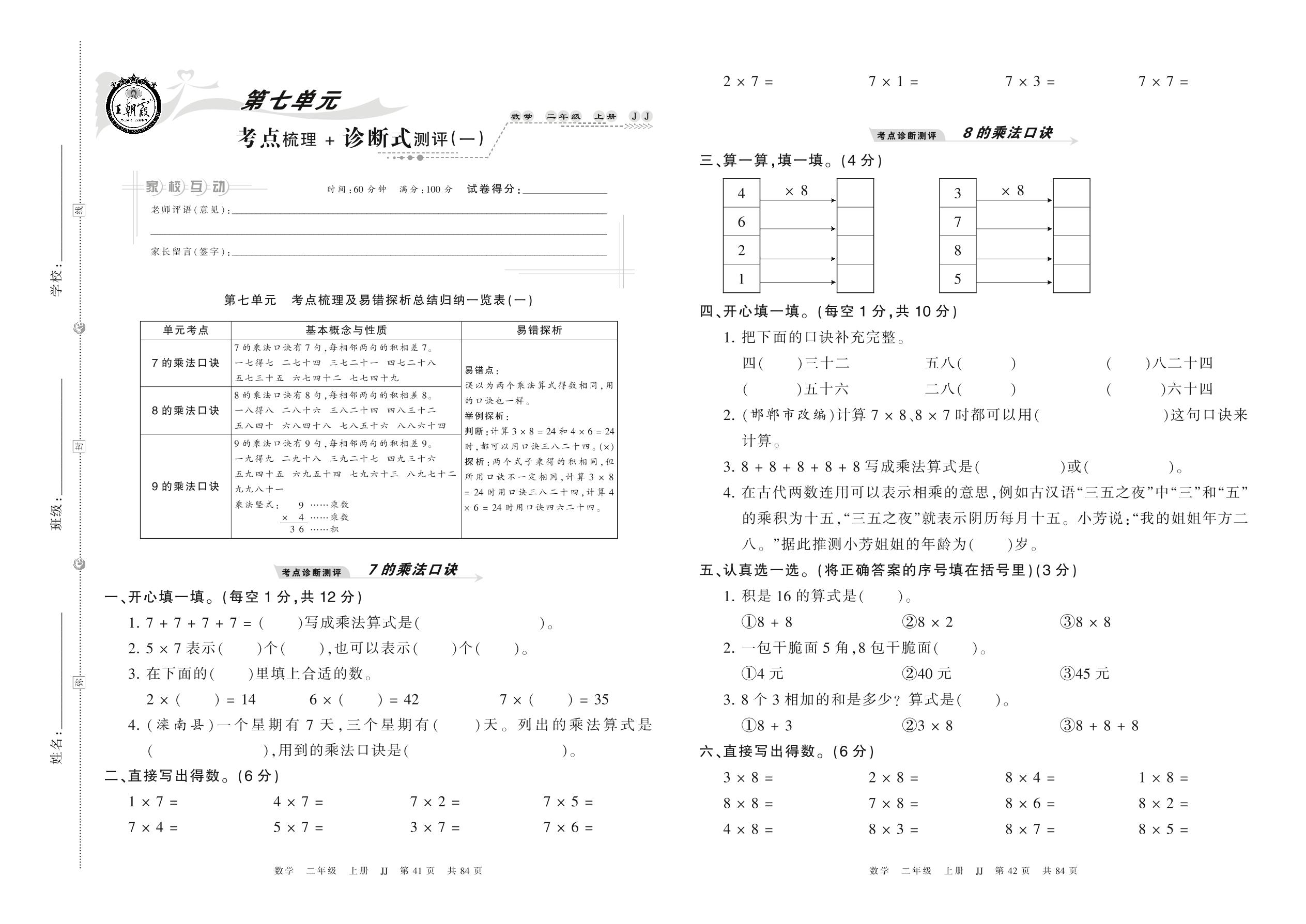 2021上册二年级数学冀教版 第七单元 考点梳理 + 诊断式测评(一)