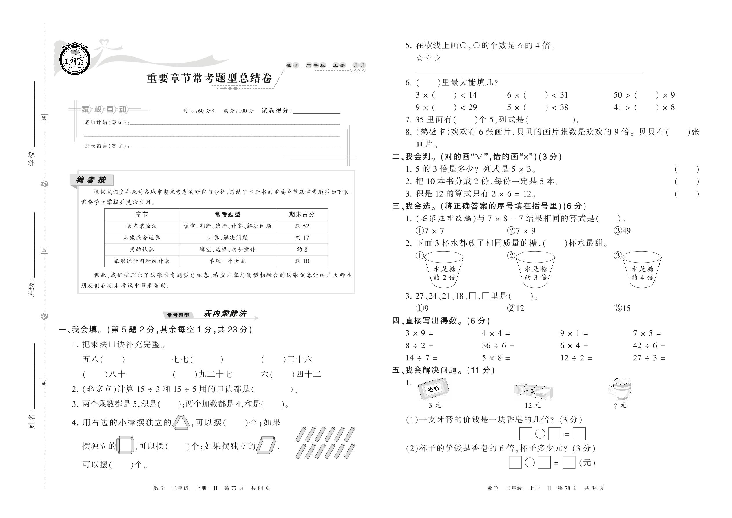 2021上册二年级数学冀教版 重要章节常考题型总结卷
