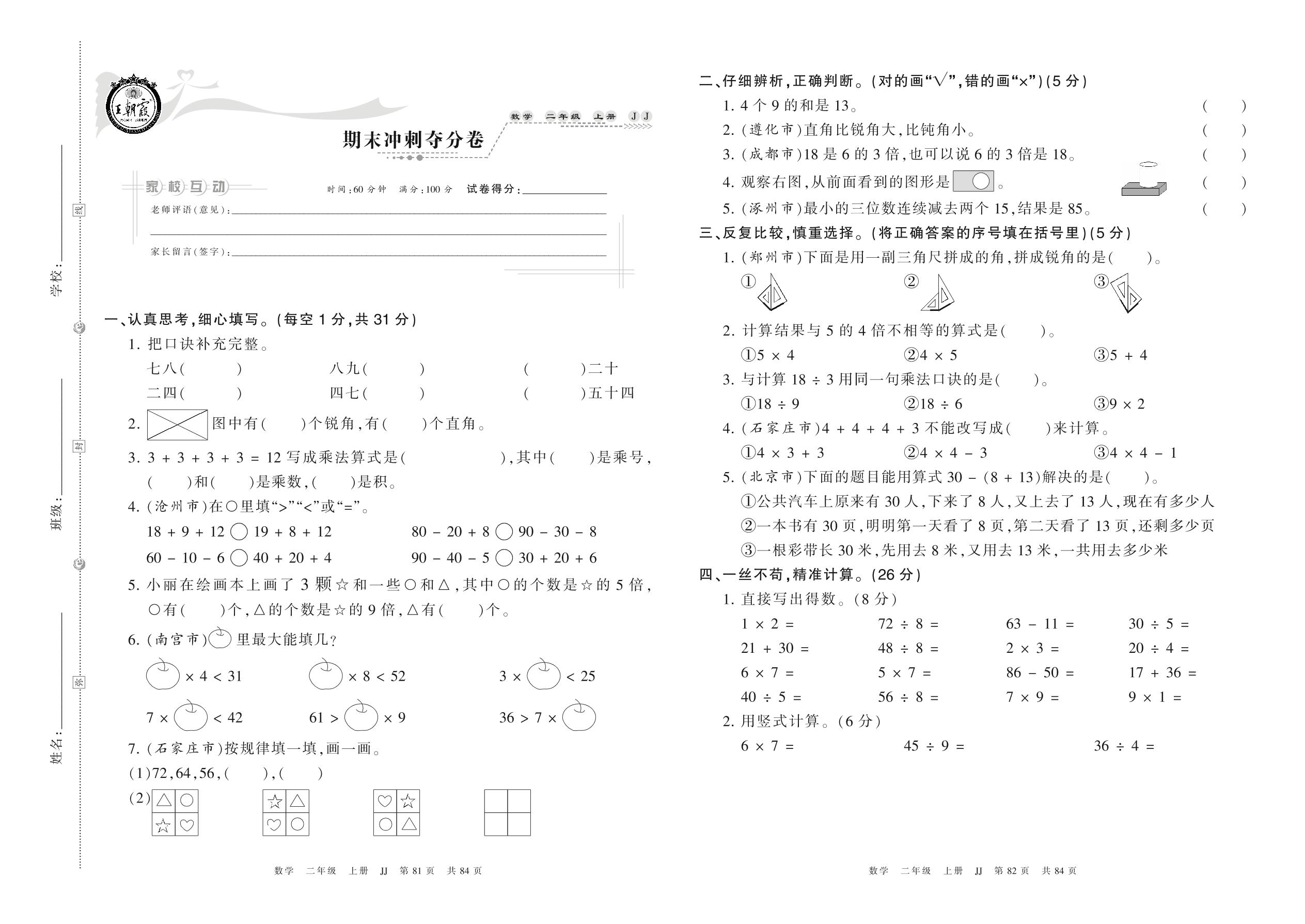 2021上册二年级数学冀教版 期末冲刺夺分卷