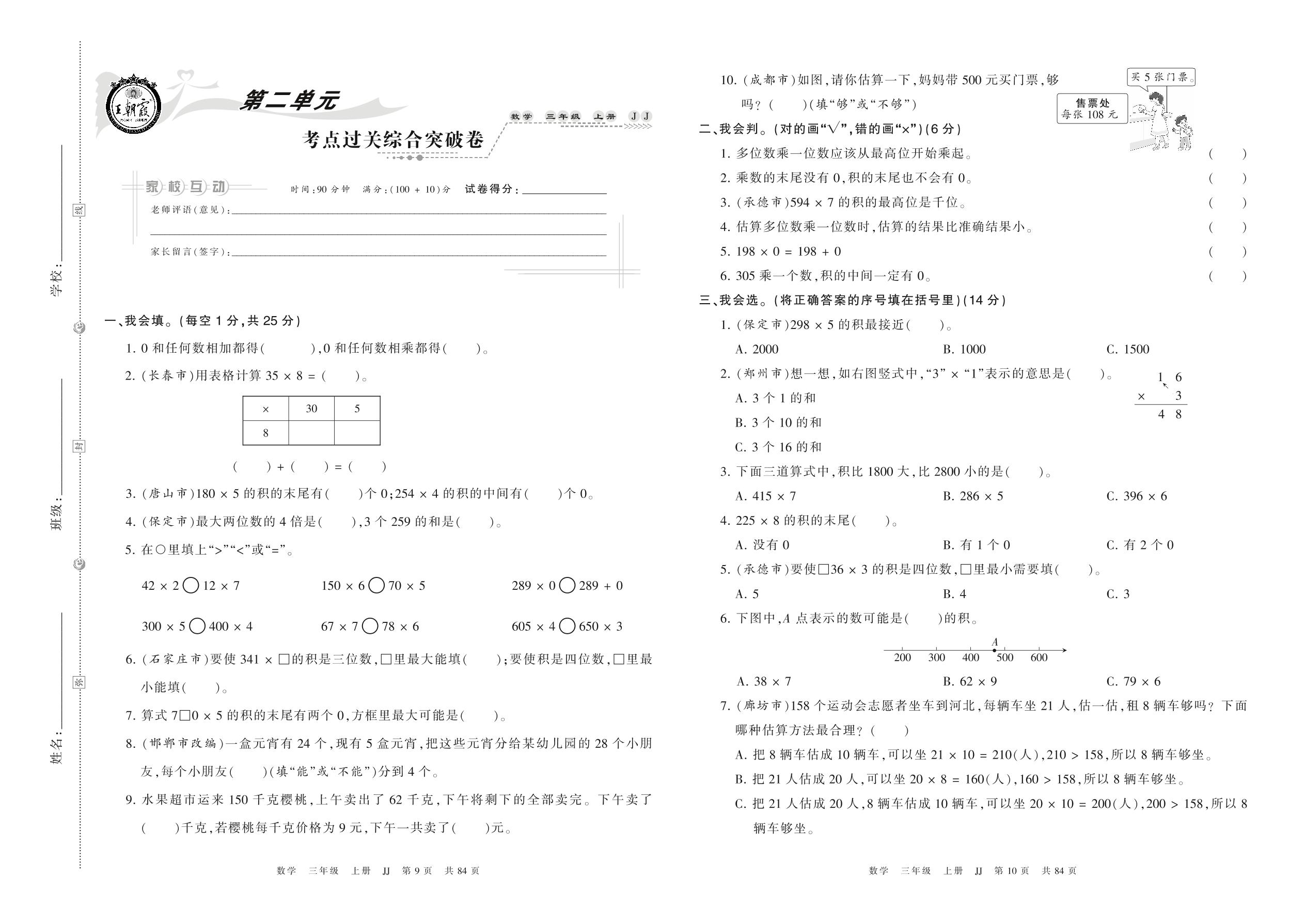 三年级数学冀教版上册单元卷