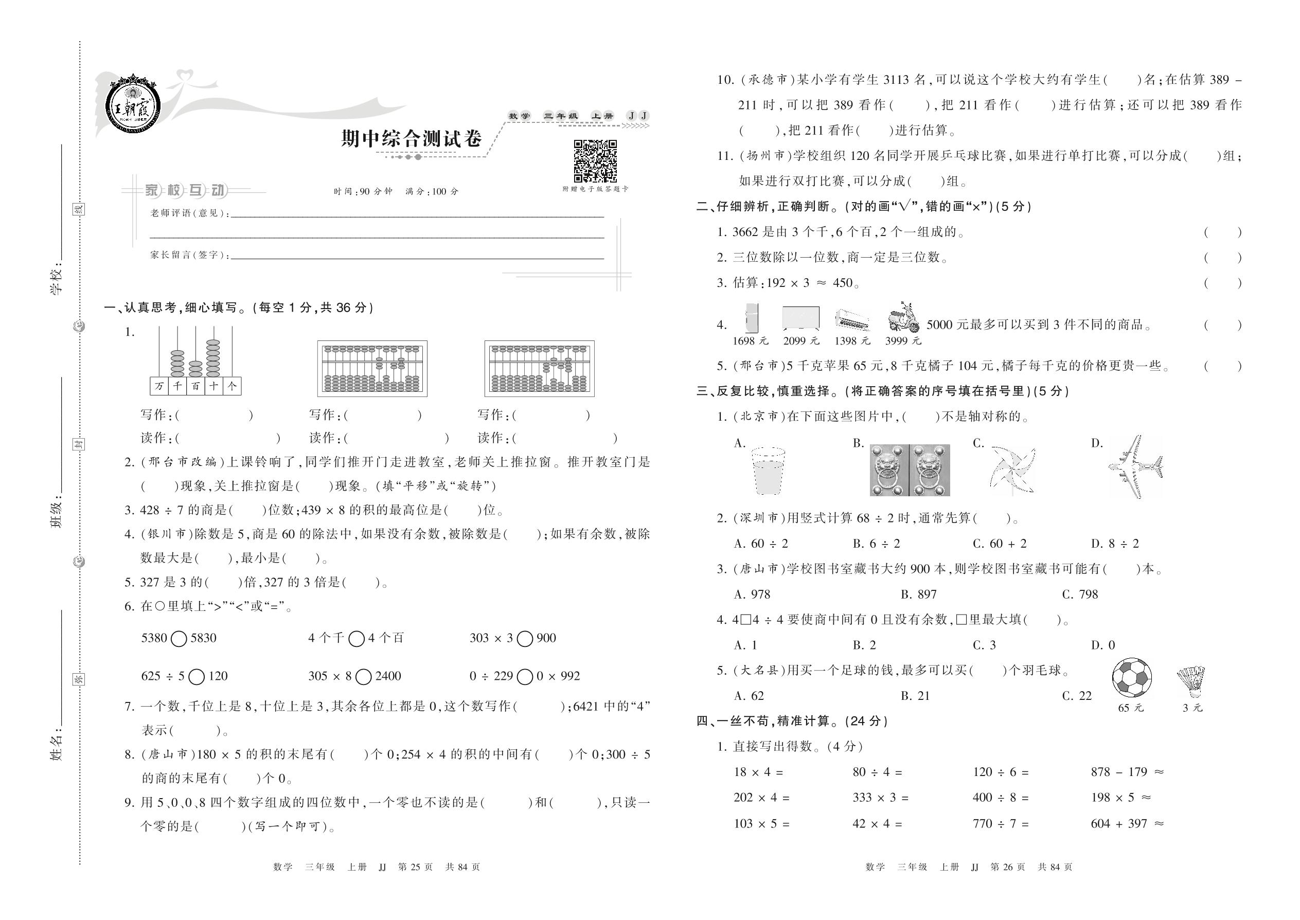 三年级数学冀教版上册期中卷