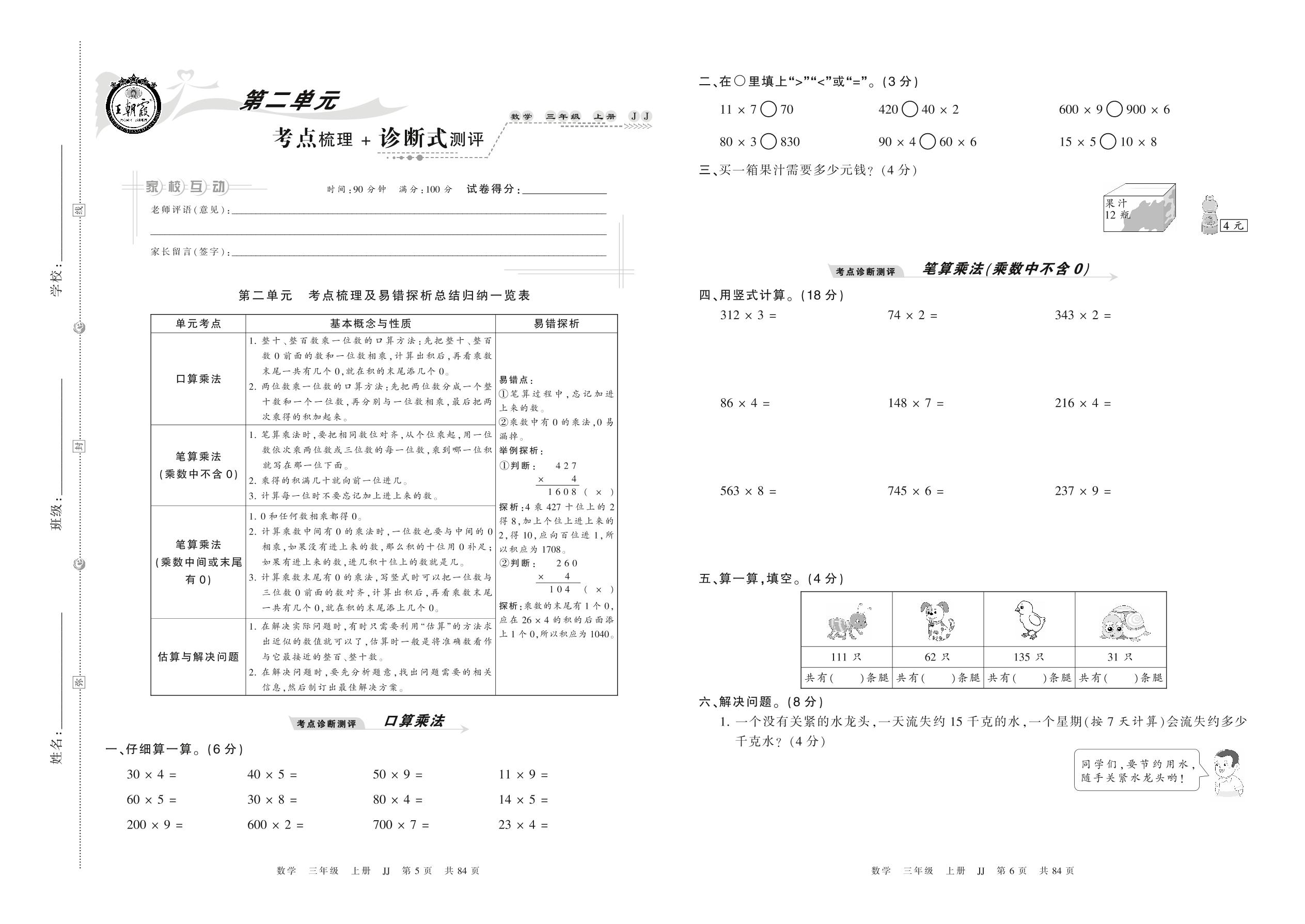 2021上册三年级数学冀教版 第二单元 考点梳理 + 诊断式测评