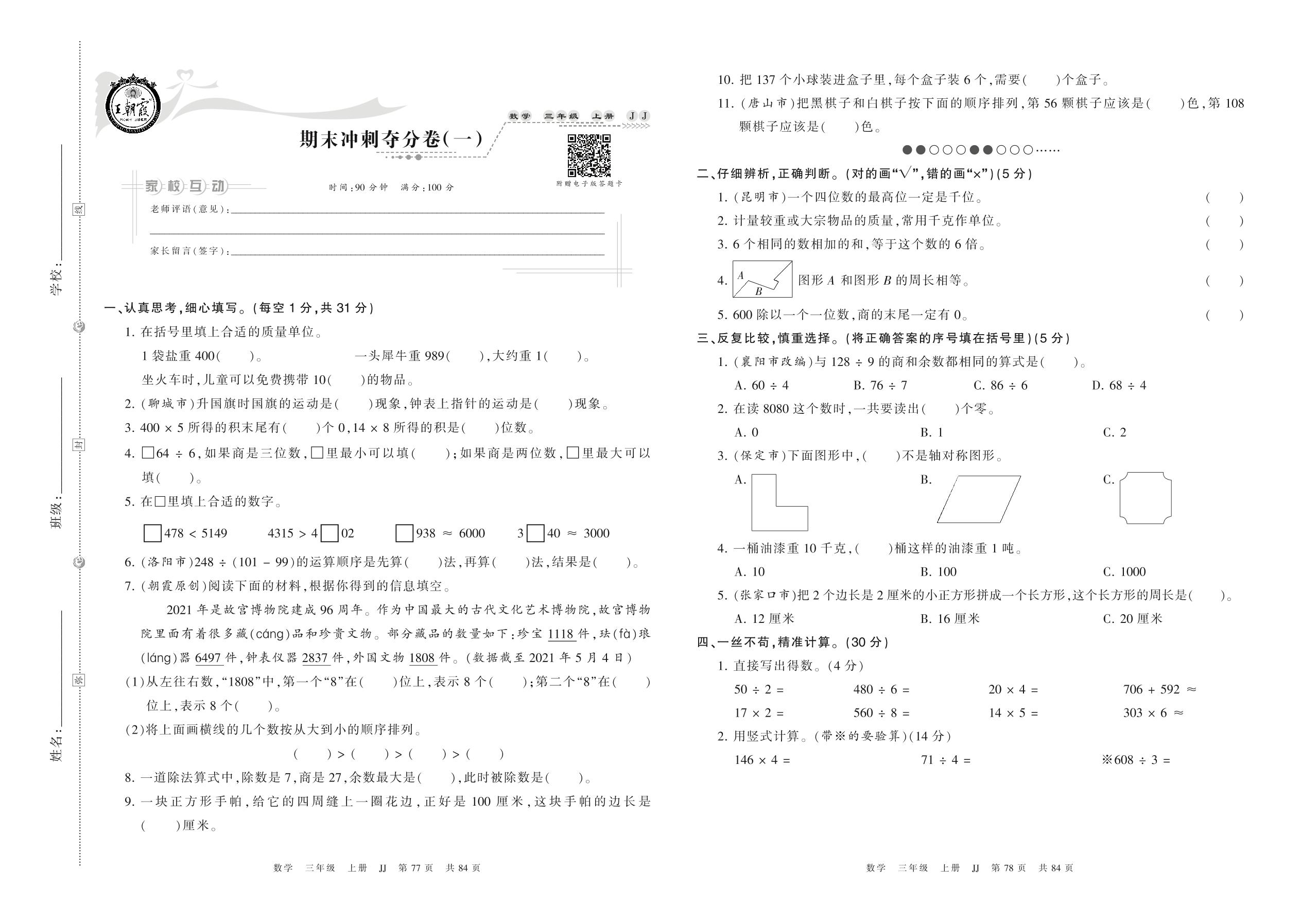 2021上册三年级数学冀教版 期末冲刺夺分卷(一)