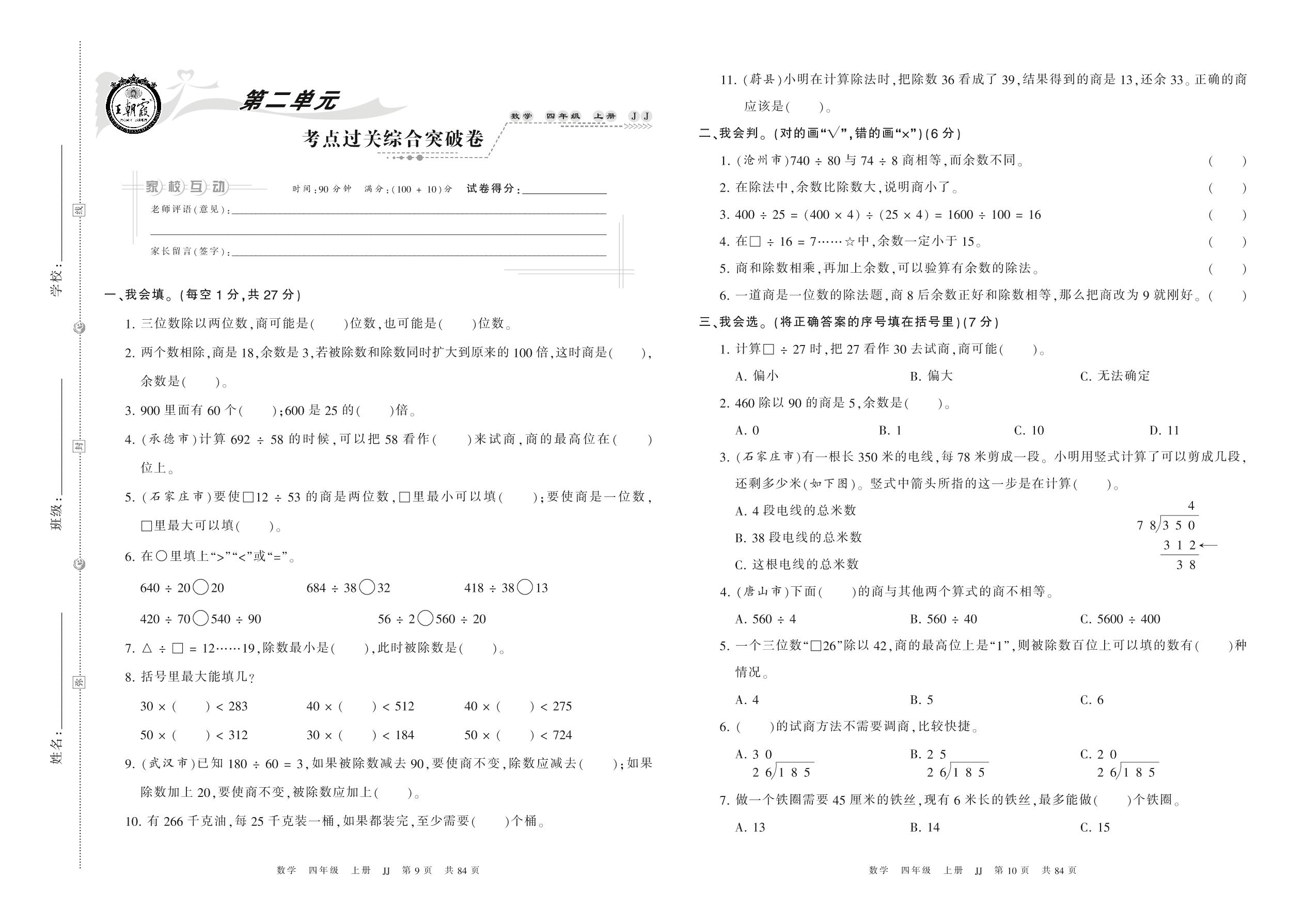 2021上册四年级数学冀教版 第二单元 考点过关综合突破卷
