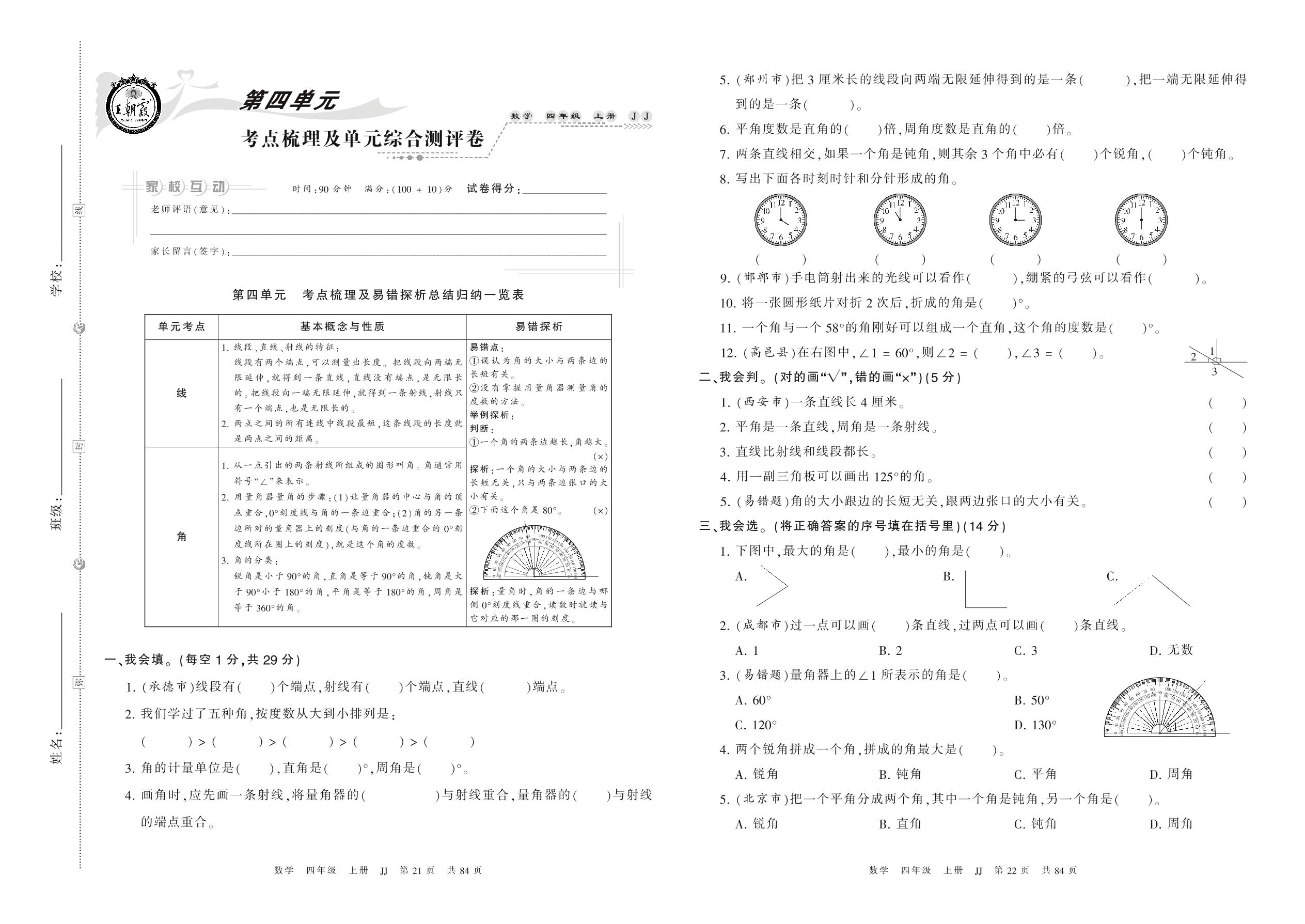2021上册四年级数学冀教版 第四单元 考点梳理及单元综合测评卷