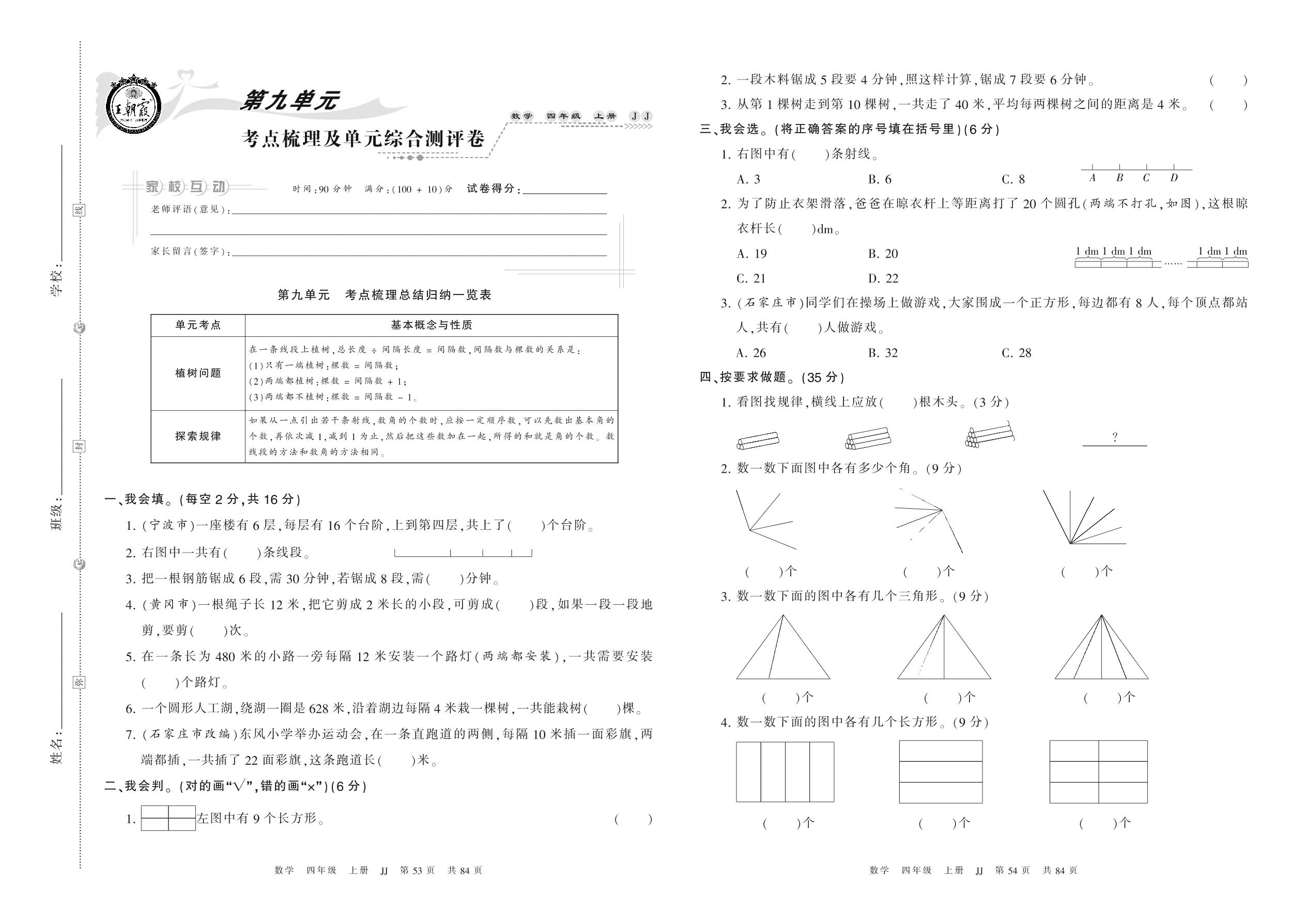 2021上册四年级数学冀教版 第九单元 考点梳理及单元综合测评卷