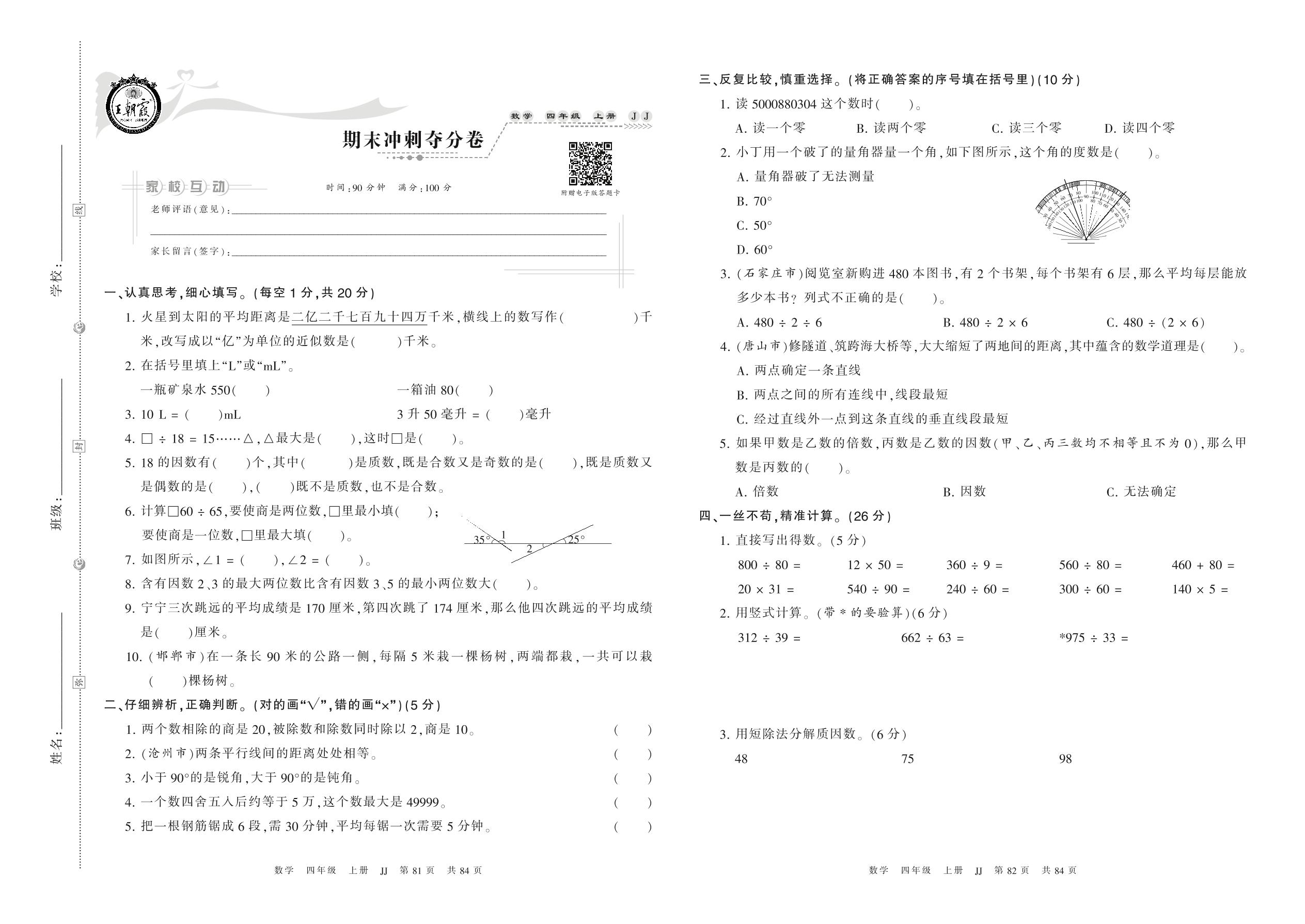 2021上册四年级数学冀教版 期末冲刺夺分卷