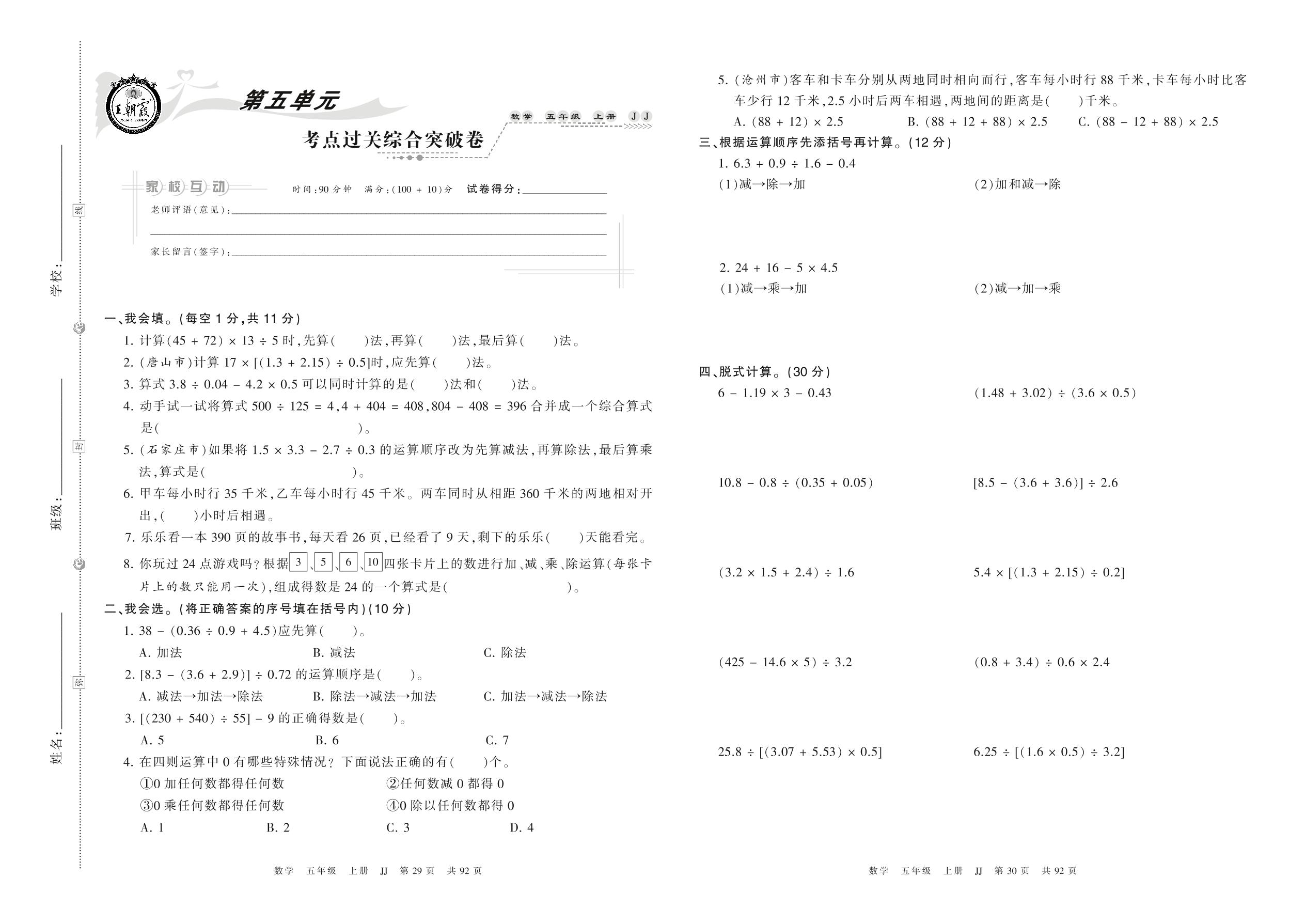 五年级数学冀教版上册单元卷