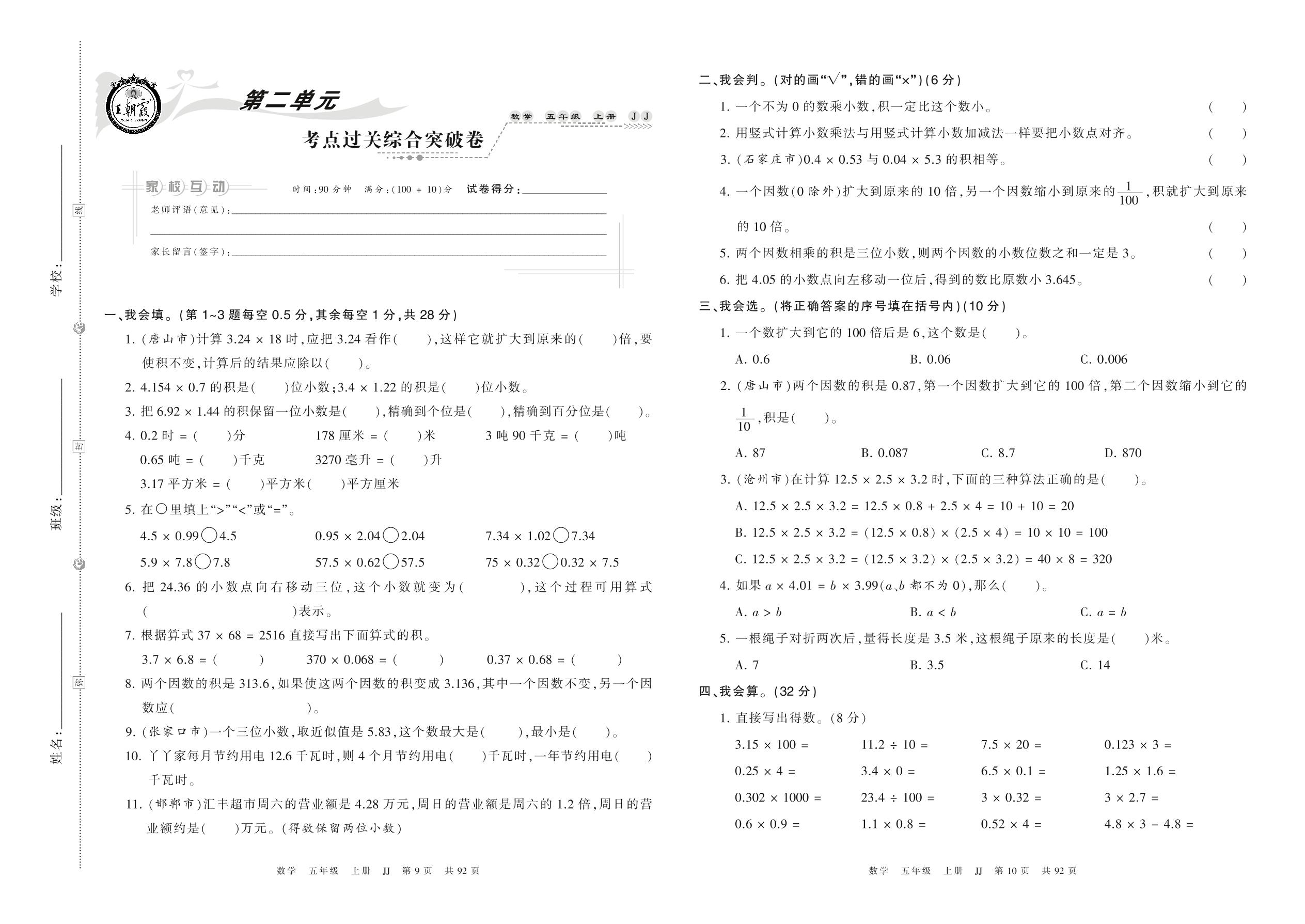2021上册五年级数学冀教版 第二单元 考点过关综合突破卷