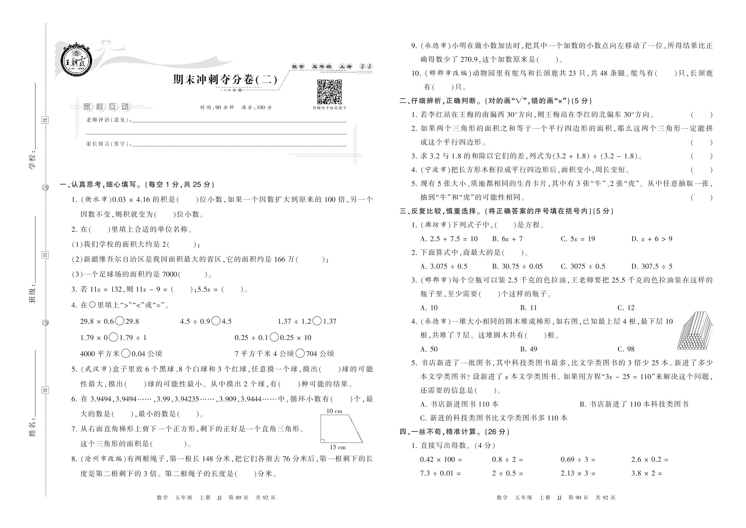 2021上册五年级数学冀教版 期末冲刺夺分卷(二)