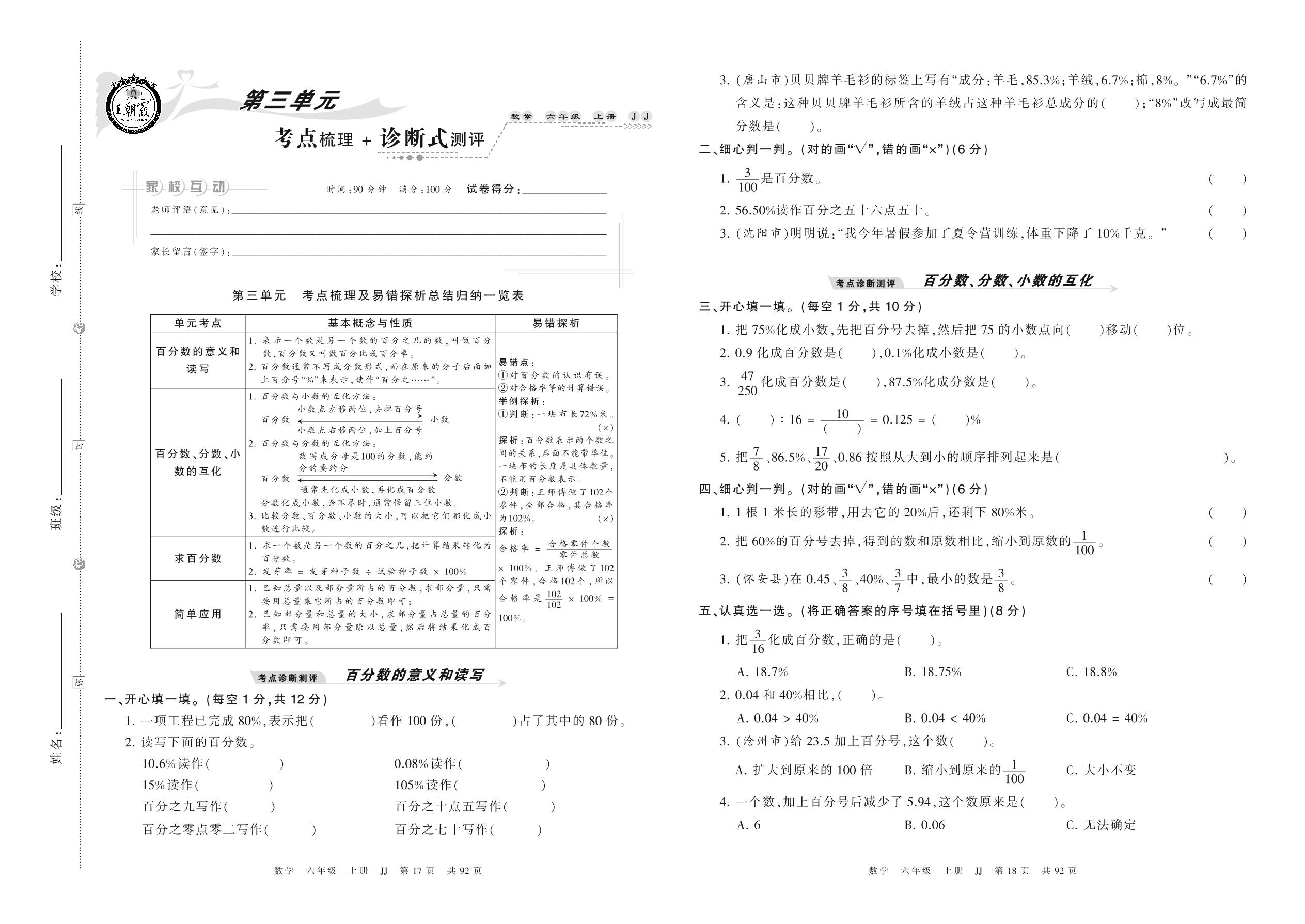 2021上册六年级数学冀教版 第三单元 考点梳理 + 诊断式测评
