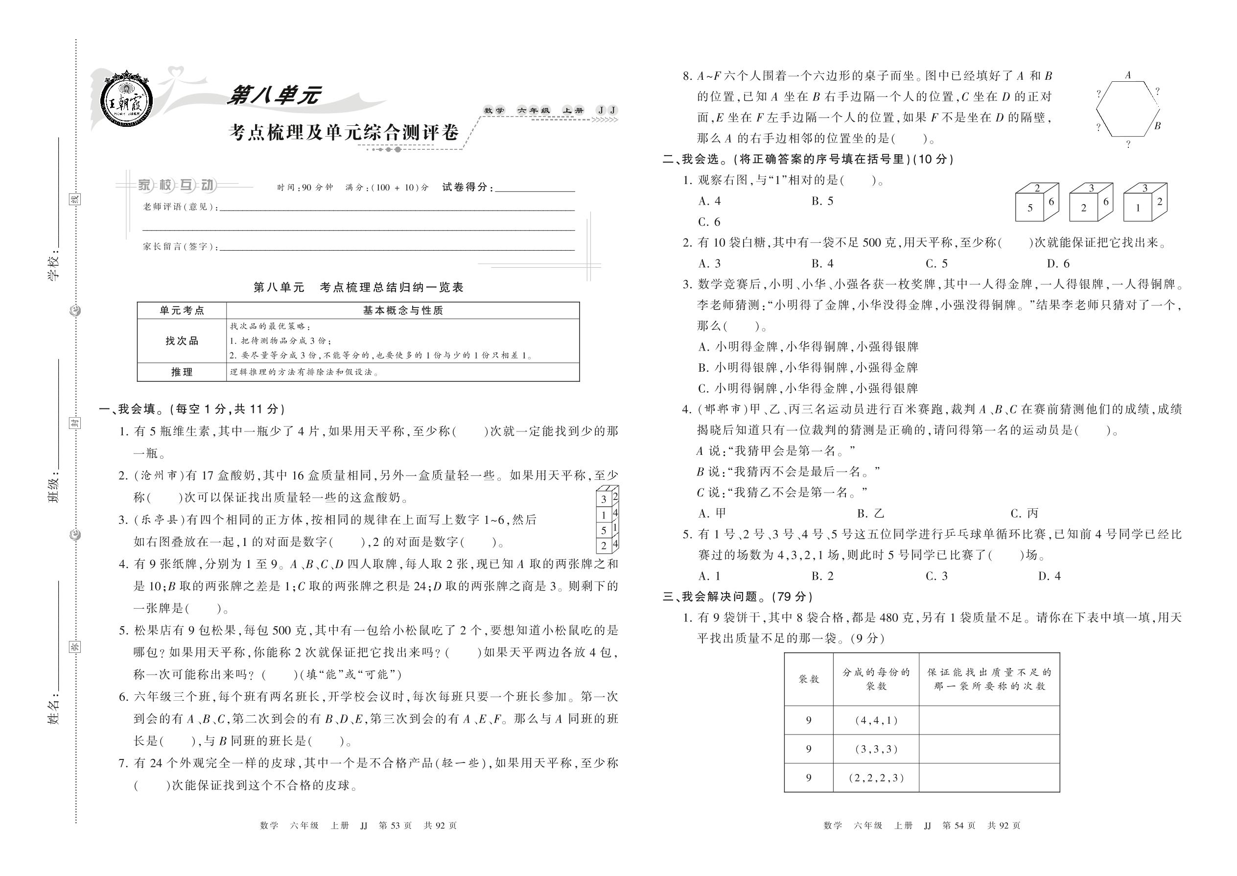 2021上册六年级数学冀教版 第八单元 考点梳理及单元综合测评卷