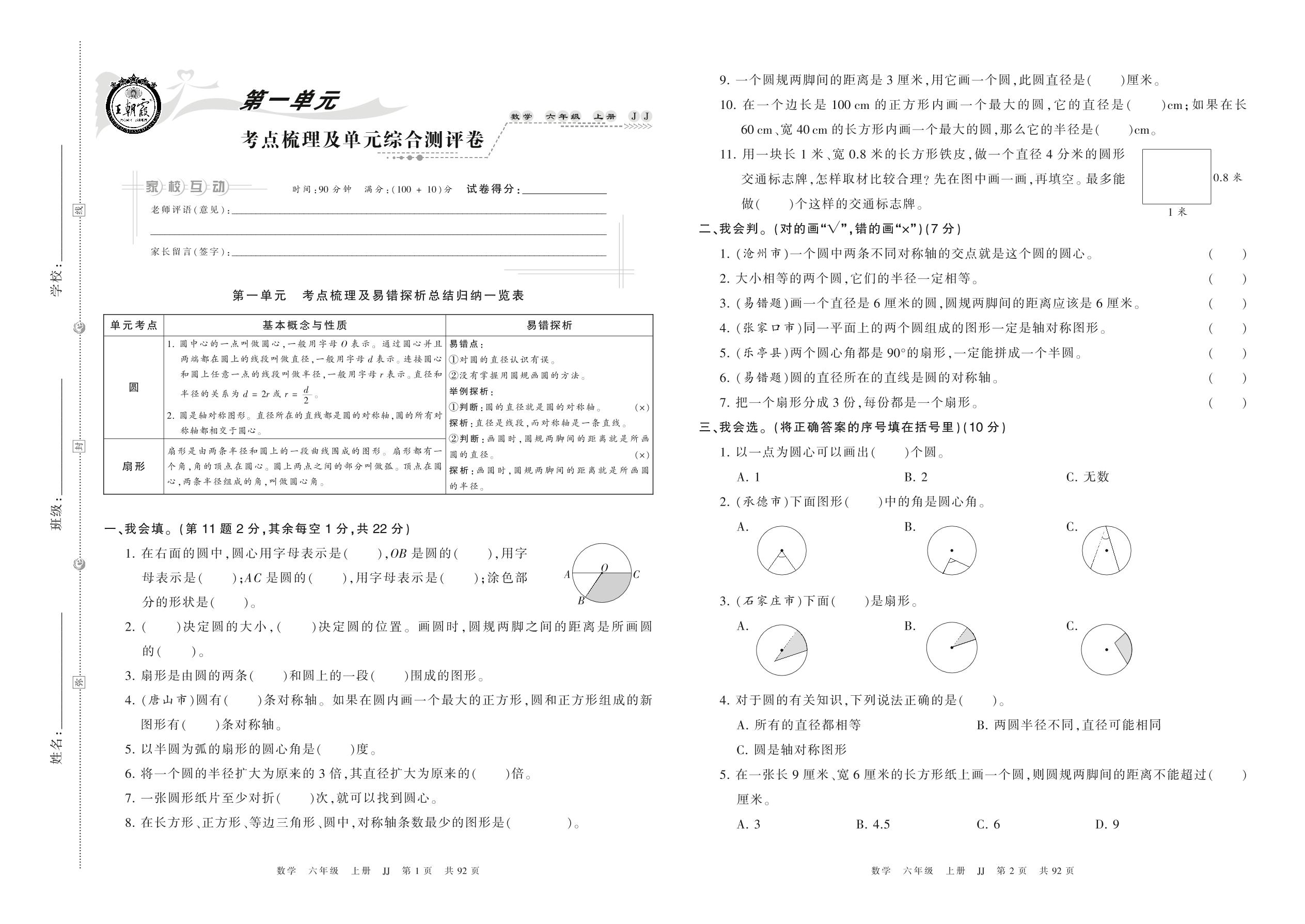 2021上册六年级数学冀教版 第一单元 考点梳理及单元综合测评卷