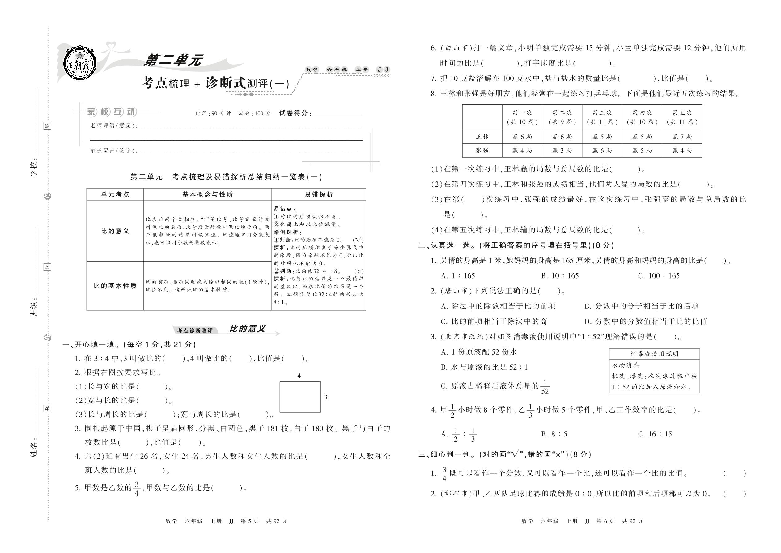 2021上册六年级数学冀教版 第二单元 考点梳理 + 诊断式测评(一)