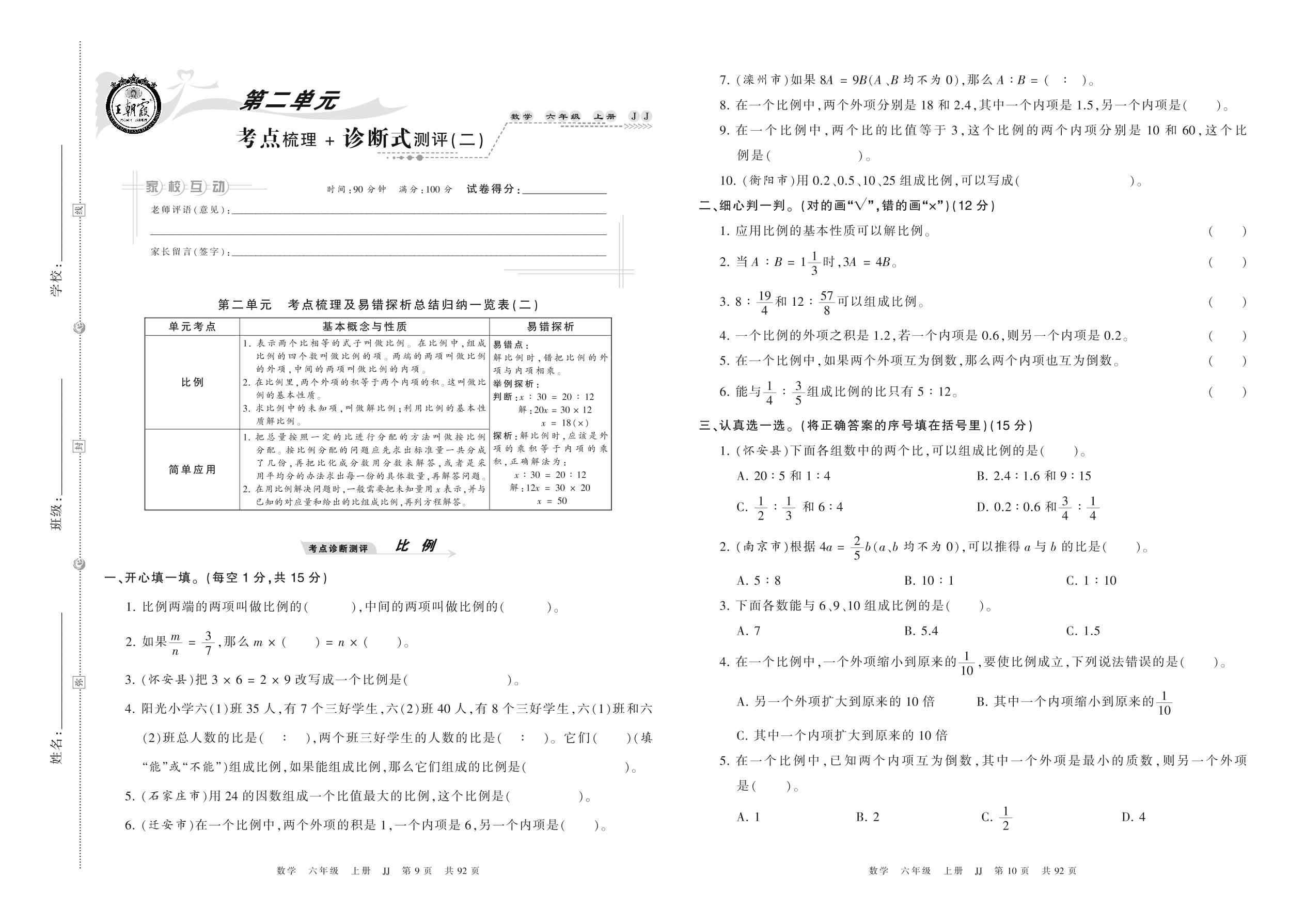 2021上册六年级数学冀教版 第二单元 考点梳理 + 诊断式测评(二)